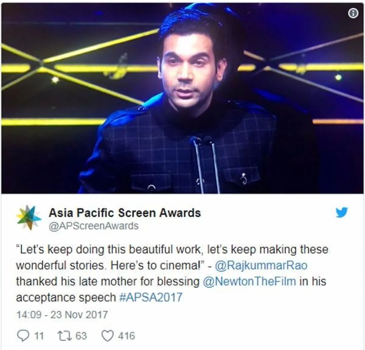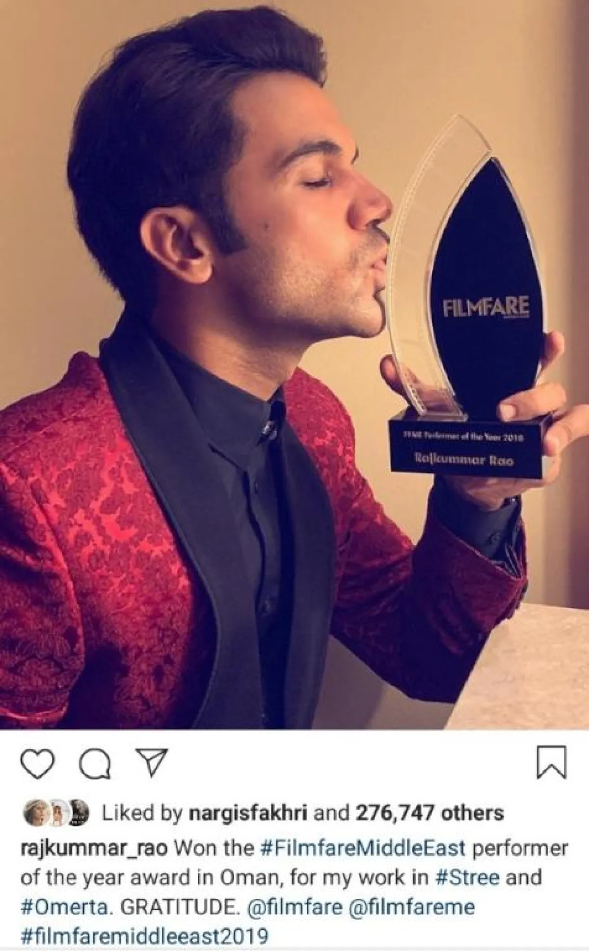 كما غرّد عن فوزه بالقول: "نلت جائزة #FilmfareMiddleEast الأفضل في العام في سلطنة عُمان الليلة الماضية، عن عملي في #Stree و #Omerta. امتنان."