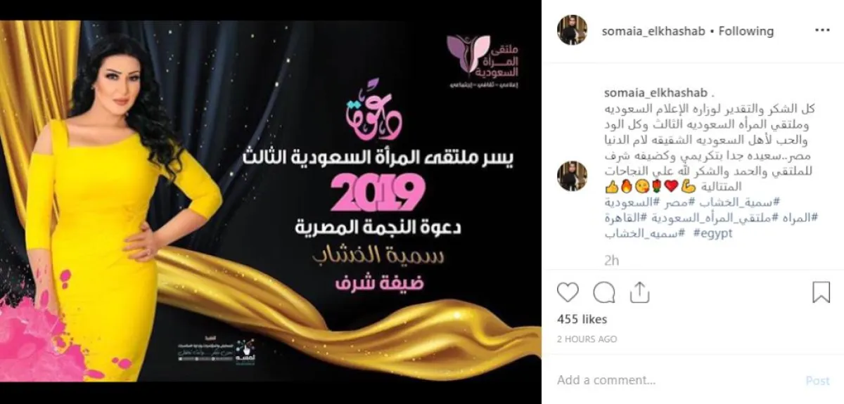 سمية أكدت أنّ دعوتها لحضور الملتقى كضيفة شرف والإعلان عن تكريمها، يعدّ نجاحًا جديدًا لها، وقالت تعليقًا على صورة الدعوة المنشورة عبر حسابها بموقع انستقرام: كل الشكر والتقدير لوزارة الإعلام السعودية وملتقى المرأة السعودية الثالث، وكل الود والحب لأهل السعودية الشقيقة لأم الدنيا مصر.. سعيدة جدًّا بتكريمي وكضيفة شرف للملتقى، والحمد والشكر لله على النجاحات المتتالية.