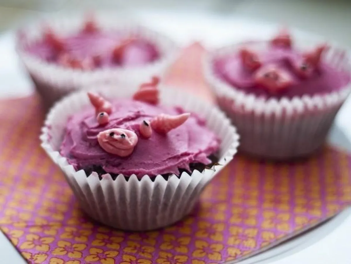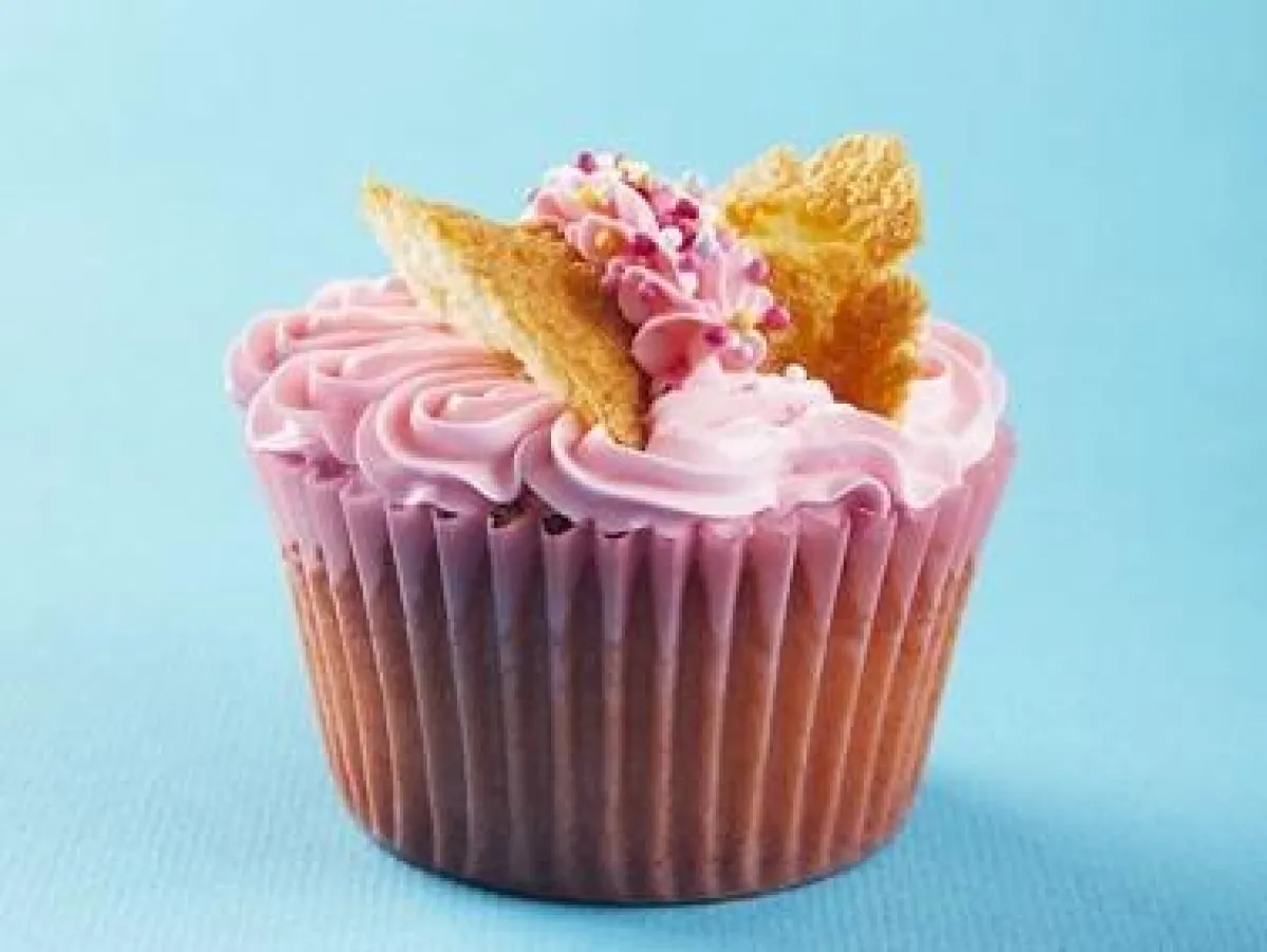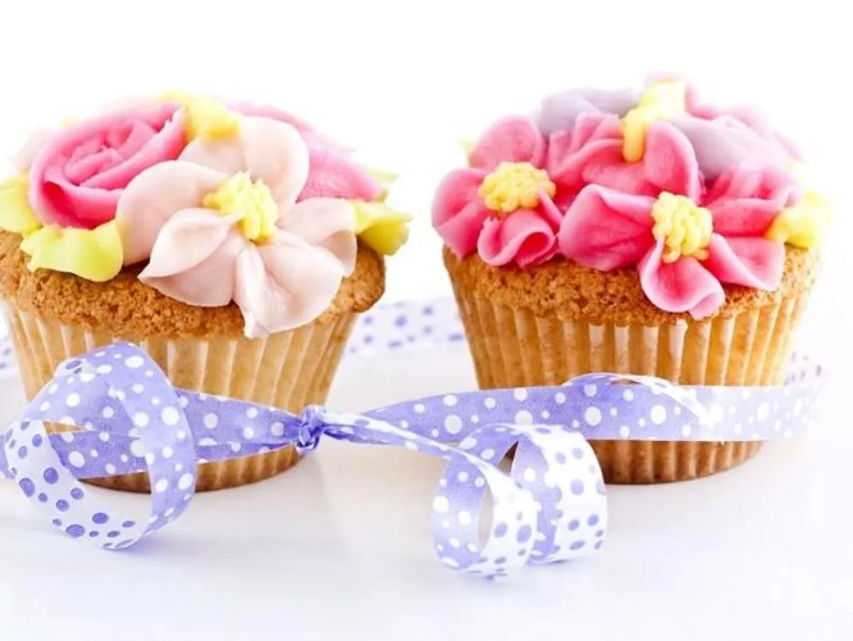 2- تلوّن كريما الزبدة بعجينة تلوين الطعام، وتستخدم لملء مخروط التزيين.يتمّ إخراج خط متعرّج من المخروط عبر الجزء العلوي من كل كعكة، لتغطيتها. يوضع الجزء العلوي من الكعكة مرة أخرى على طبقة التزيين لتبدو كجناحي الفراشة.
