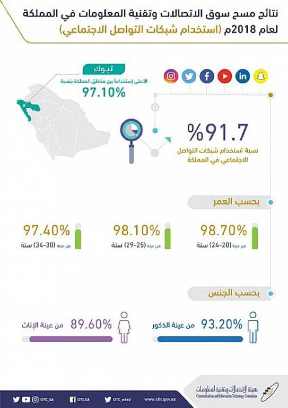 بلغ عدد الأفراد الذين يستخدمون شبكات التواصل الاجتماعي في المملكة 91.7%، وذلك وفقاً لما كشفت عنه هيئة الاتصالات وتقنية المعلومات اليوم في دراستها التحليلية الشاملة لسوق خدمات الاتصالات وتقنية المعلومات في المملكة الخاصة باستخدام وسائل التواصل الاجتماعي.