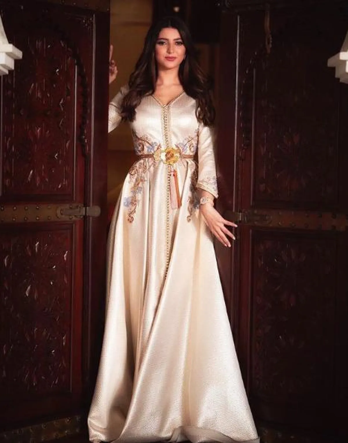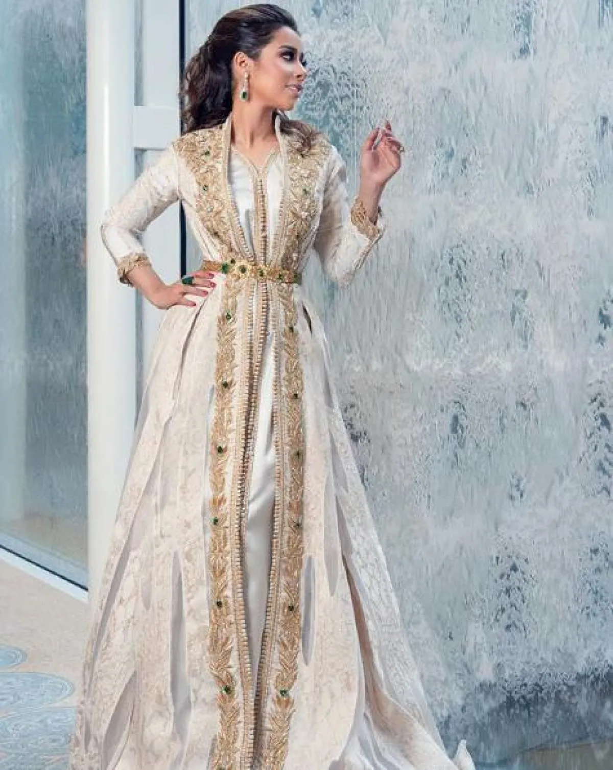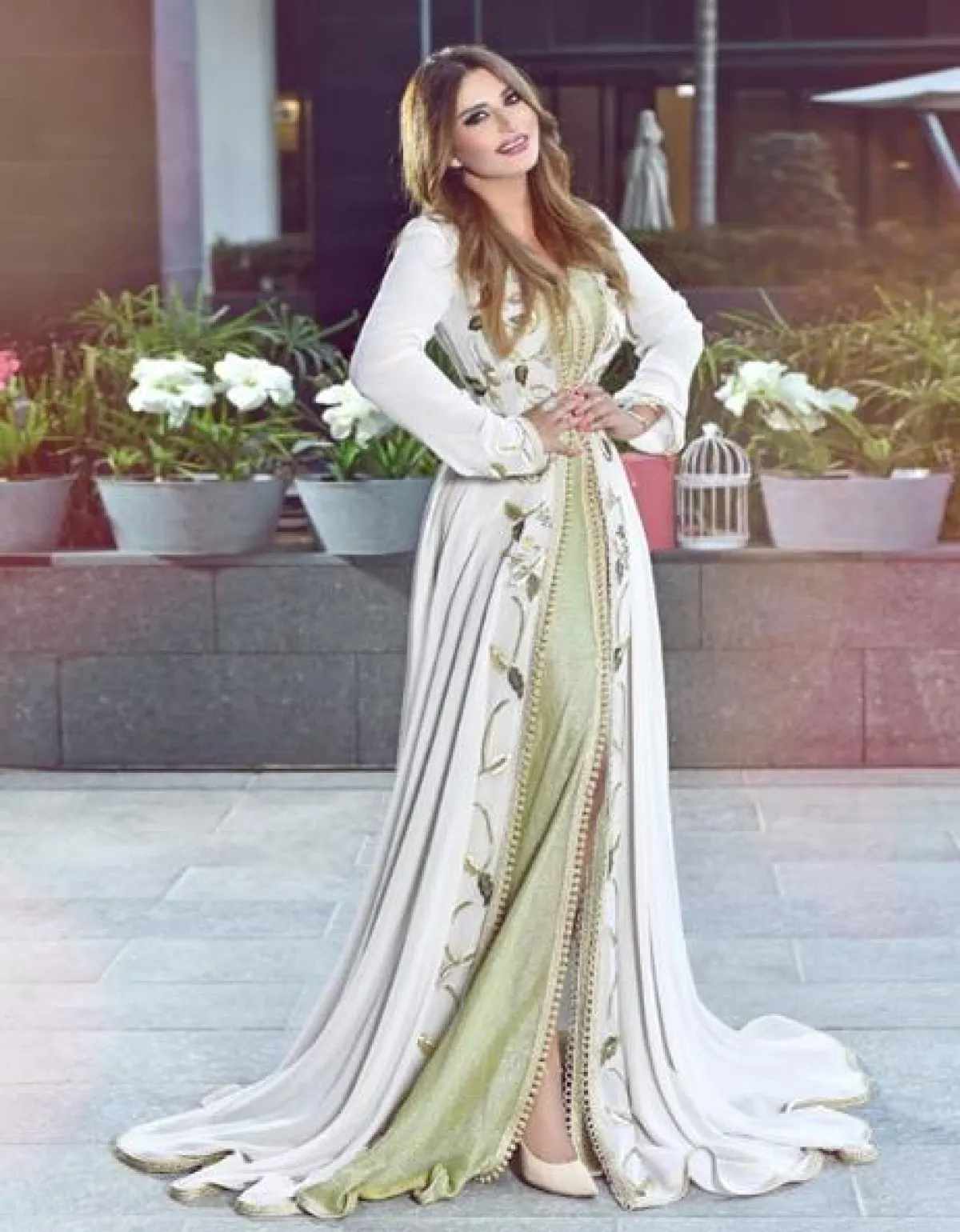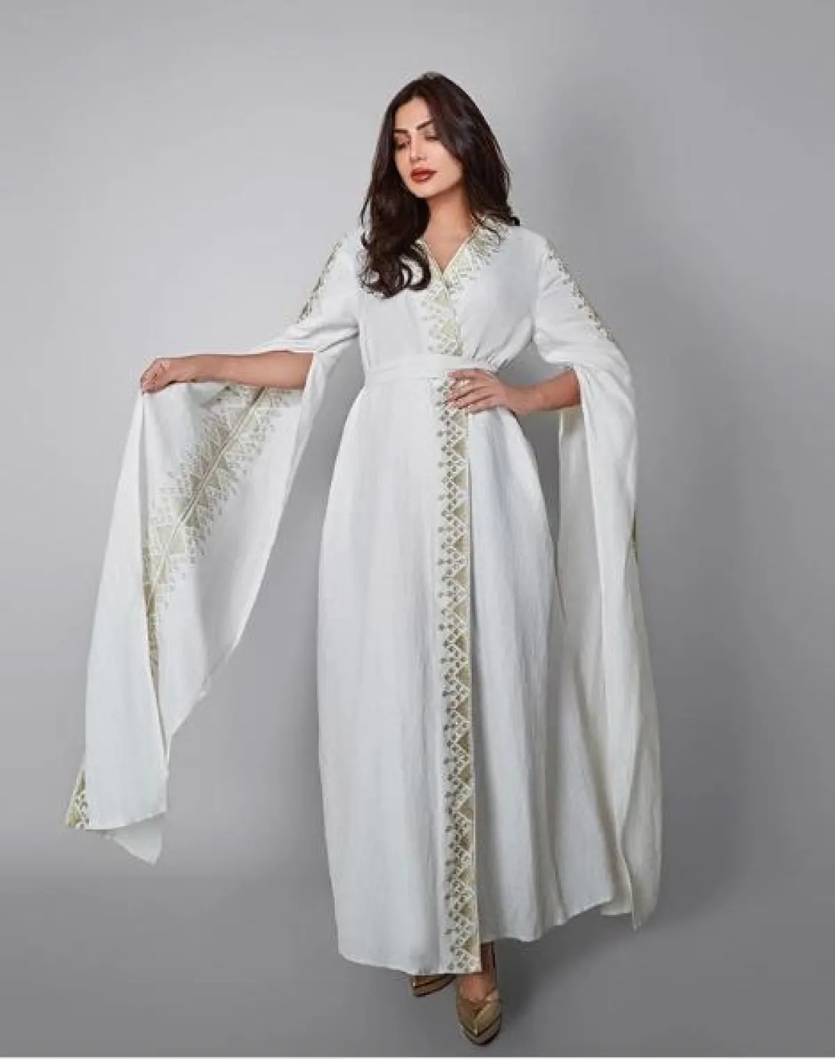 في حال كنتِ بتحثين عن اطلالة ناعمة في القفطان، مثالية للمناسبات المسائية والزيارات، ننصحكِ أن تستوحي من اطلالة أمل العوضي، التي اختارت قفطانًا مميزًا باللون الأبيض، مطرزًا بطريقة بسيطة بالخيوط الذهبية على شكل زخرفات شرقية، محدّد الخصر وأكمامه طويلة تصل حدّ الكاحل، وقد نسقت معه حذاءً بكعب عالٍ باللون الذهبي المعدني.