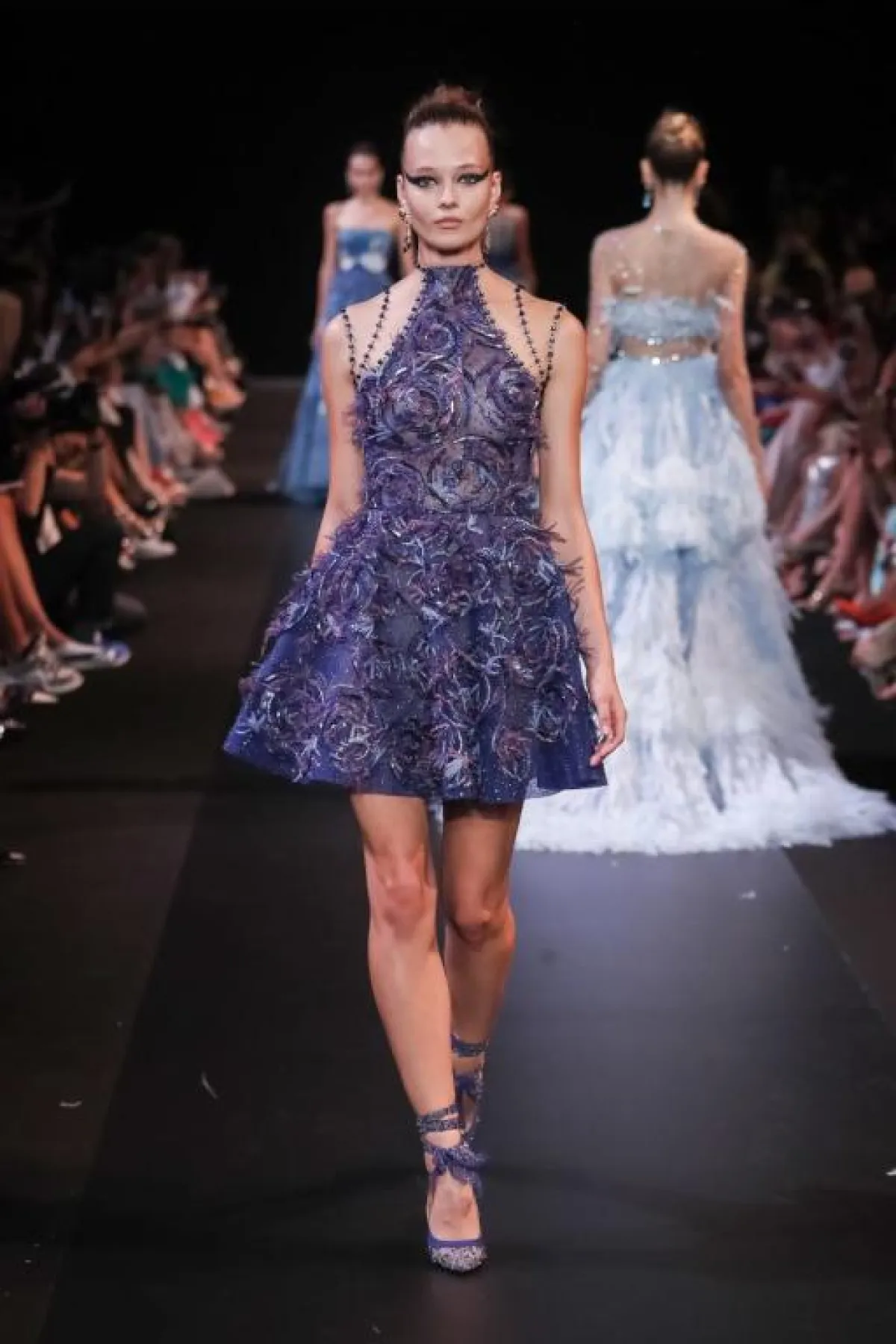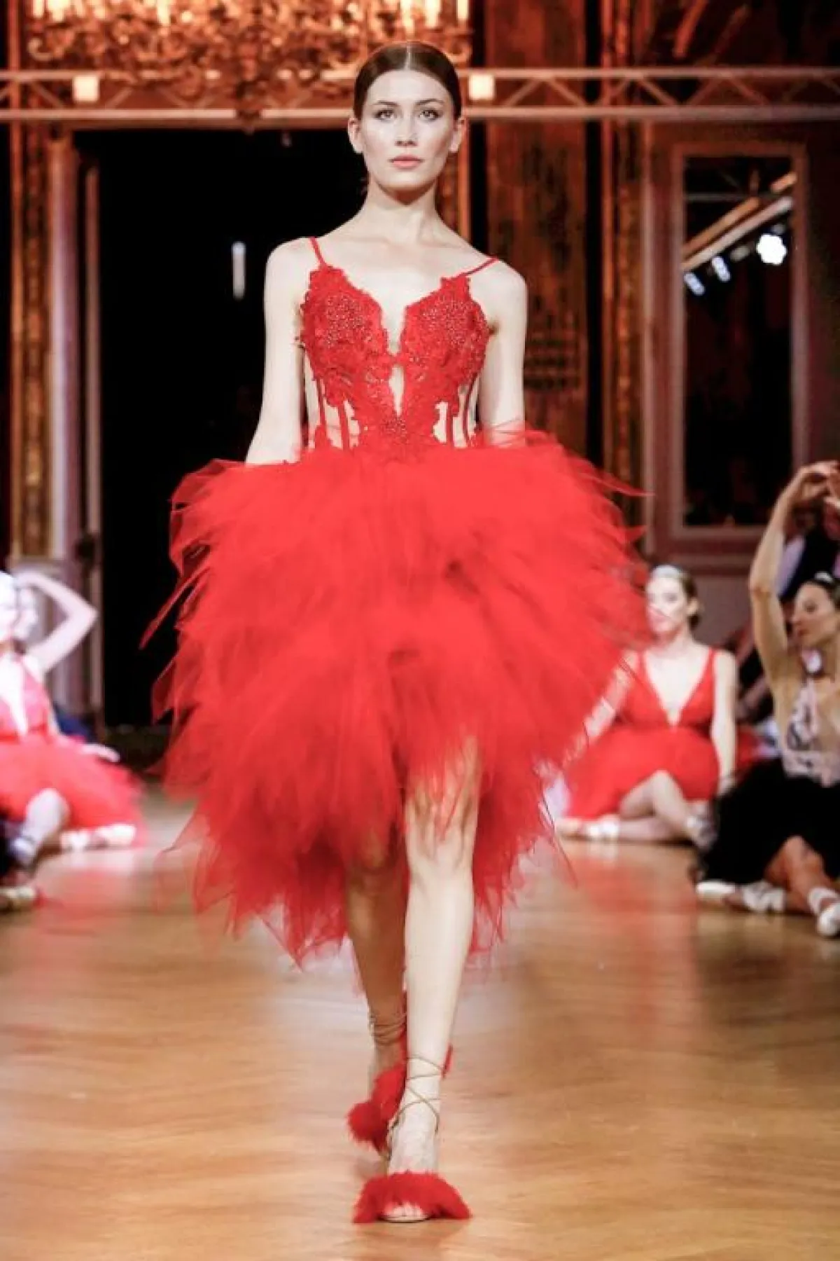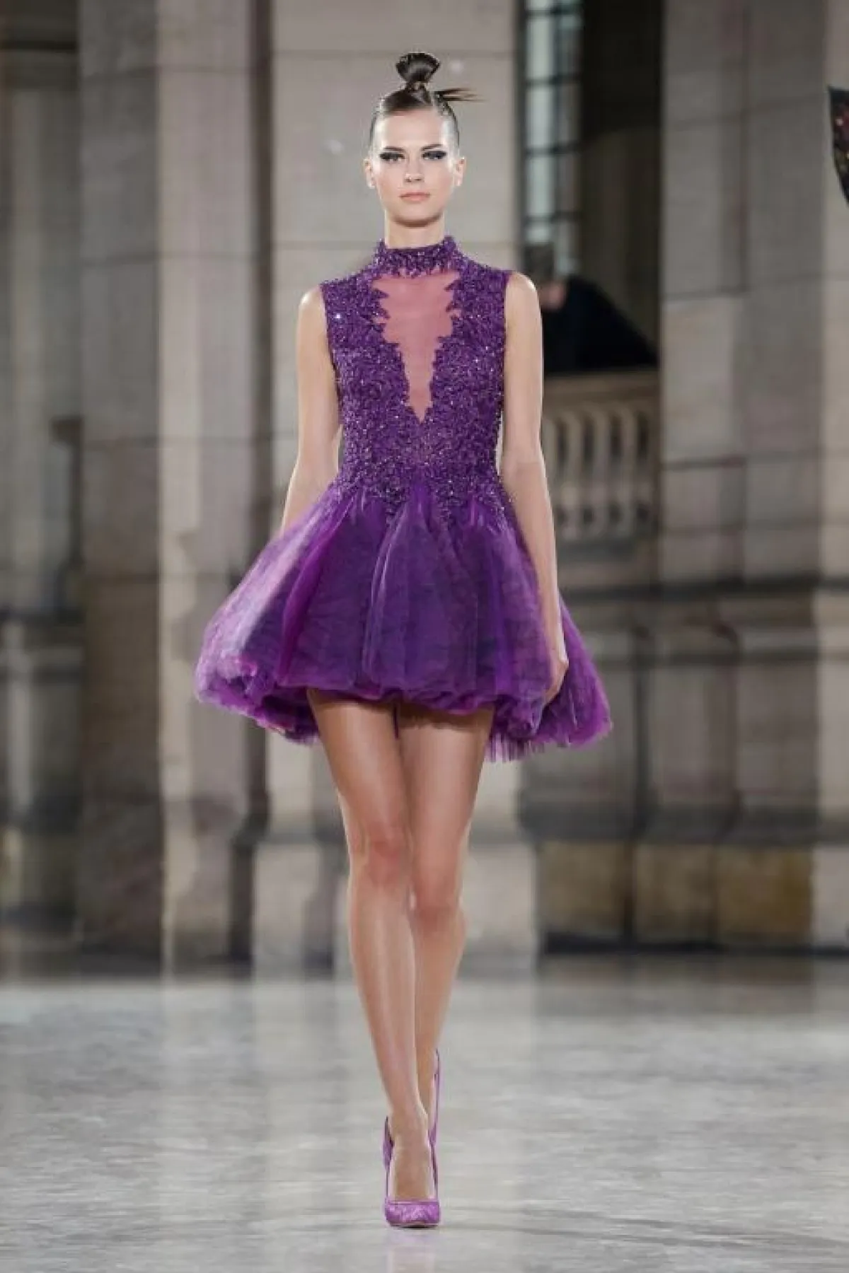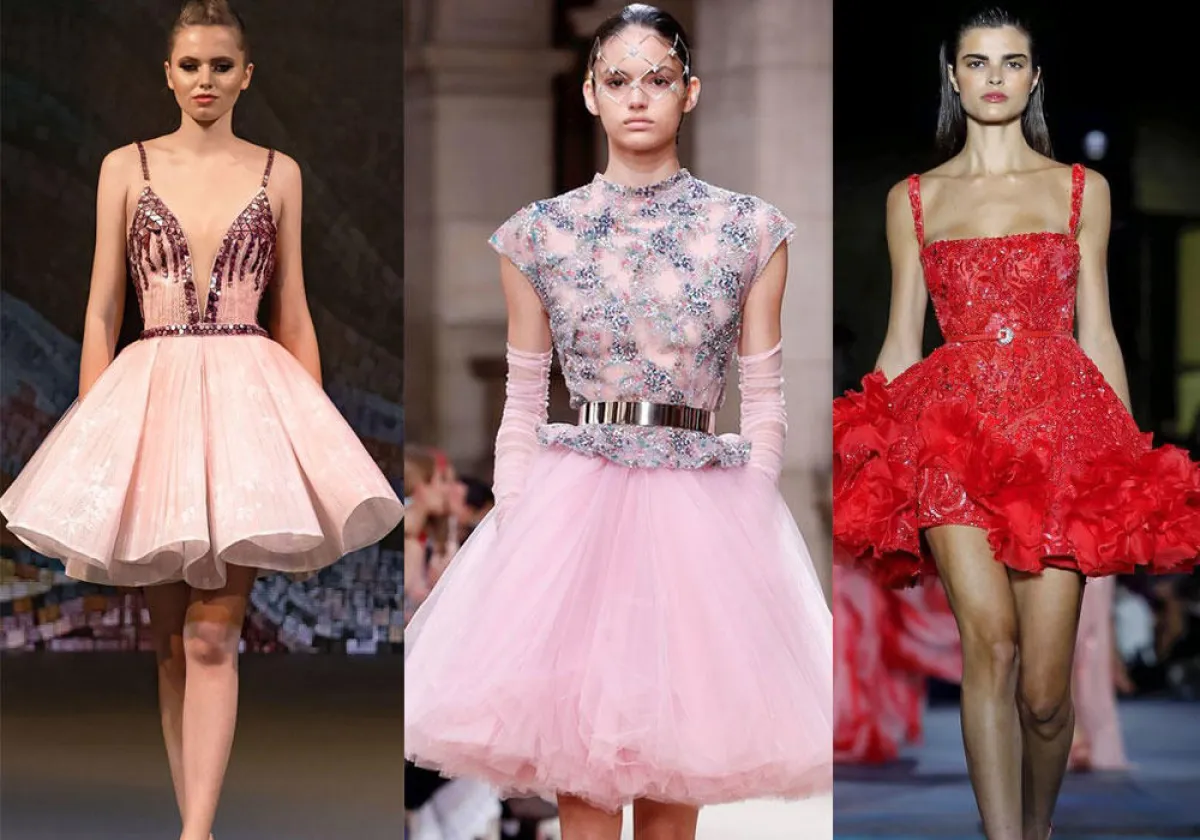 ولا يشترط أن تكون التنورة القصيرة المنفوشة من التول، بل يمكن أن تكون بأقمشة أخرى مع ثنيات وطيّات في التنورة مثل فساتين طوني ورد Tony Ward، وRabih Edris.