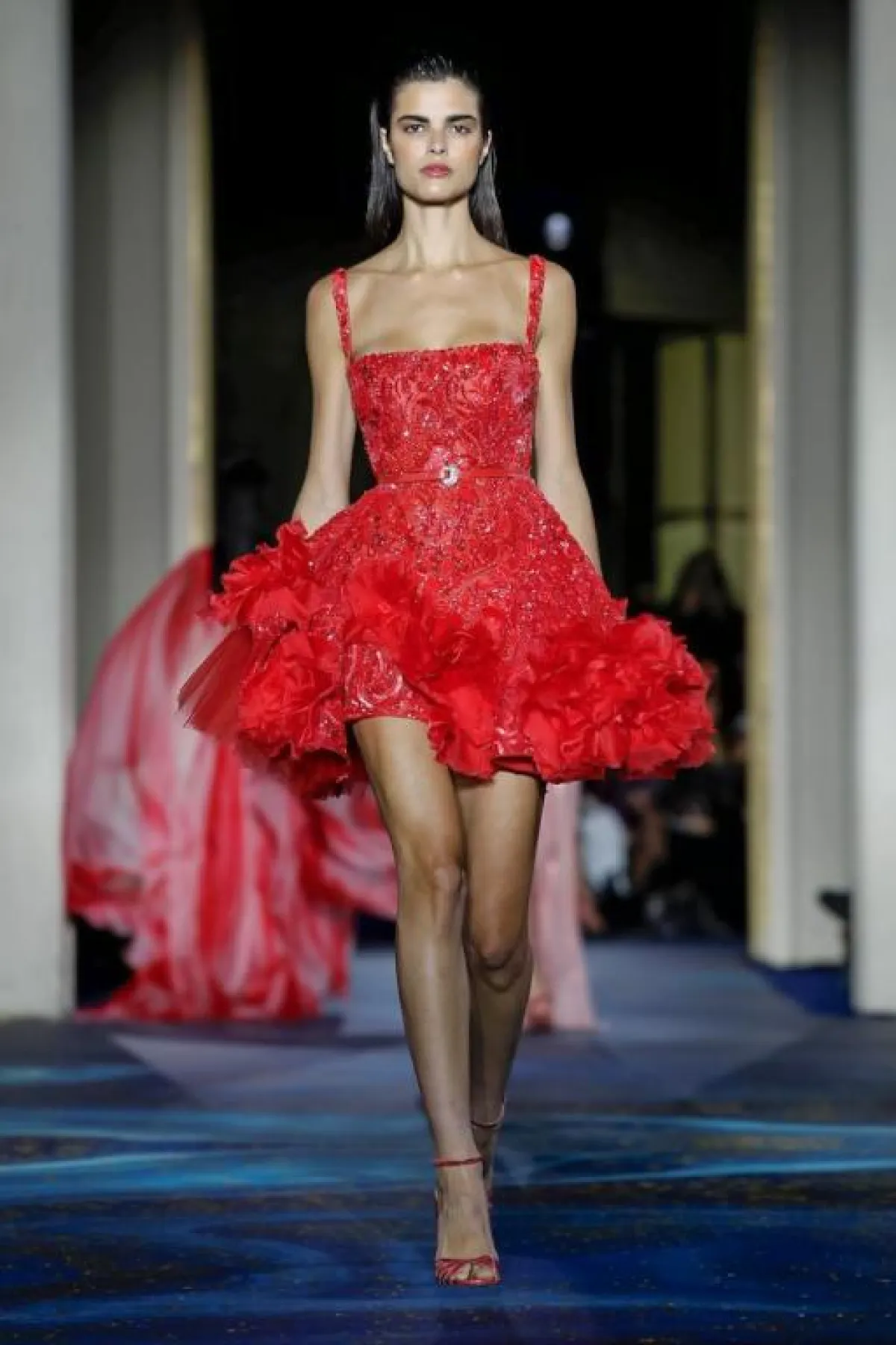 لإطلالة جريئة، إختاري فستان خطوبة قصير باللون الأحمر، فهو من أبرز ألوان الموضة الرائجة لهذا العام، مثل فستان Eva Minge بالتنورة التول، وفستان زهير مراد Zuhair Murad بالحمّالات الرفيعة وحزام الخصر، والمزين بتطريزات برّاقة.