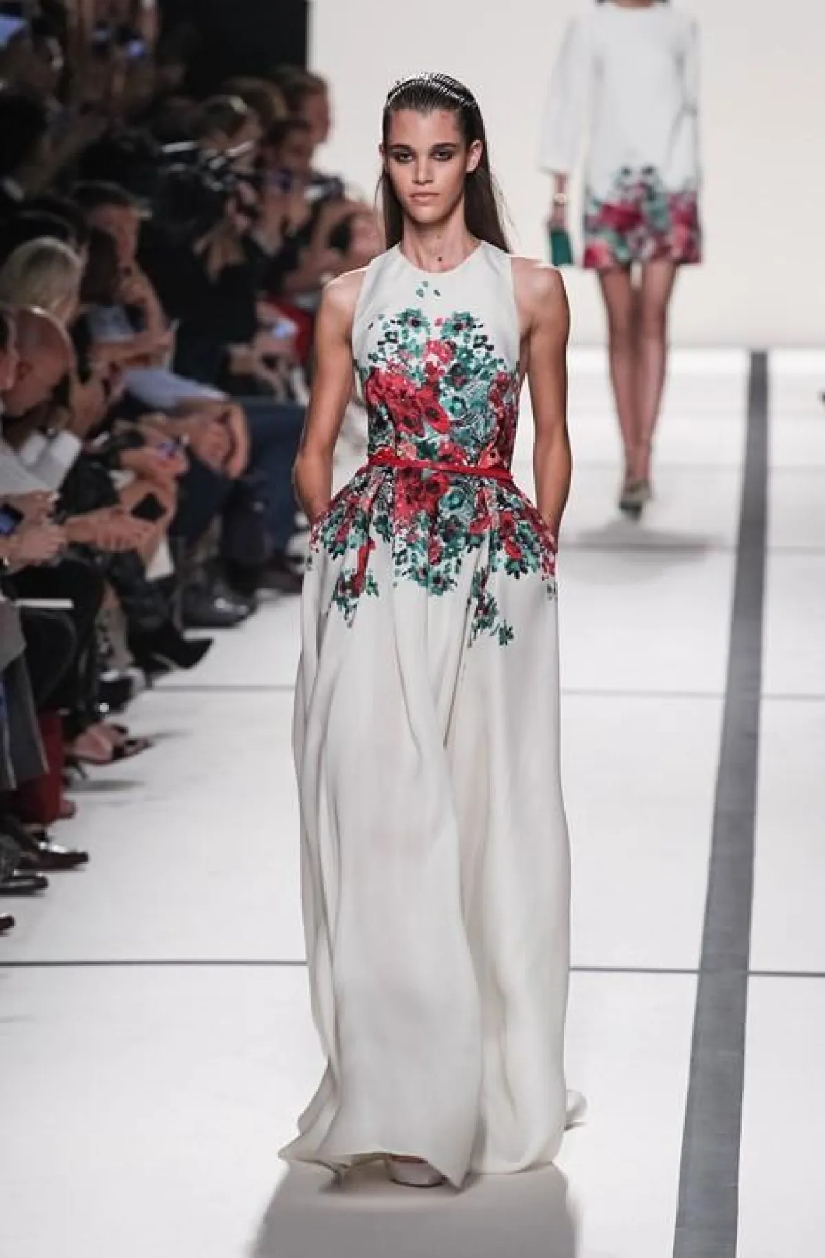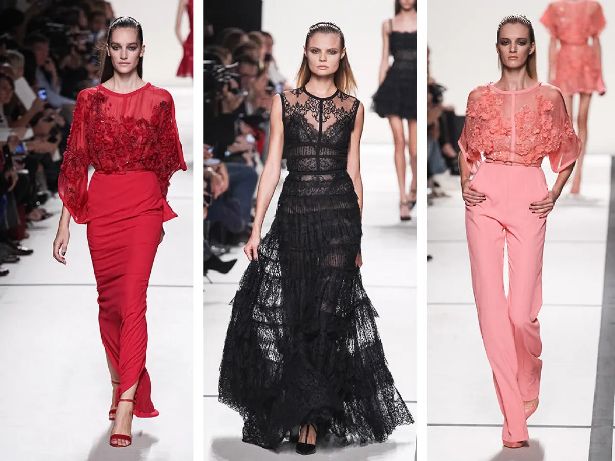 زاد عرض إيلي صعب من جمال حديقة "تولييه" الأثريّة، حيث قدّم تشكيلة ربيعيّة بامتياز، استوحاها من ورود فصل الربيع وهي في أوج تفتّقها؛ تشكيلة عبّر فيها عن مدى عشقه للمرأة والطبيعة، وترجمه في أزياء صُنعت من أقمشةٍ، كانت بطلتها "دانتيل دو شانتييه" ذات اللون الأسود الأنيق، التي رسمها على أجساد العارضات بالكثير من الجرأة التي لم نعهدها في أزياء إيلي صعب، ومن أنوثة الدانتيلا، إلى ألق الأبيض المستوحى من وردة الكاميليا وأحمر "البولافييله" وأخضر عشب فصل الربيع. وأكّد لنا إيلي صعب، مرّة أخرى، أن لا أحد مثله يمتلك فنّ وسرّ اختيار الألوان التي زادت من جمال فساتين السهرة، التي انسابت على أجساد العارضات بالكثير من الأنوثة، في أزياء تنوّعت ما بين فساتين الكوكتيل الدائريّة المصنوعة من القماش المطبّع بباقات من الأزهار والسراويل المستقيمة المصاحبة للتوبات المطرّزة ببتلات الورد المصنوعة من نفس اللون.