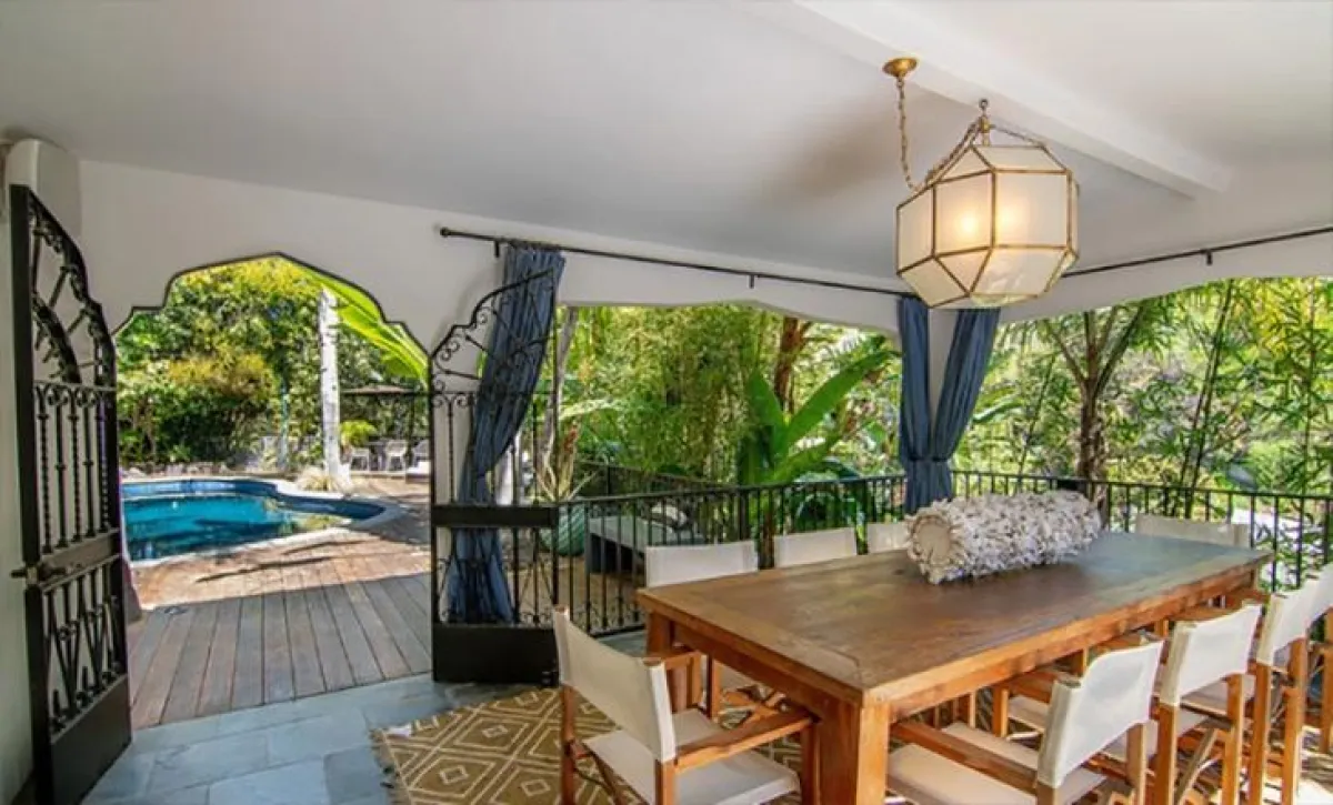 إلى جانب المساحات المفتوحة، يُقدِّم المنزل كلّ معايير الترفيه والراحة، كما تحلُّ غرفة الطعام المفتوحة مكان تلك الداخليَّة، وذلك عندما تكون الحرارة لطيفة. وثمة حوض استحمام ساخن يطلُّ على حمّام السباحة.