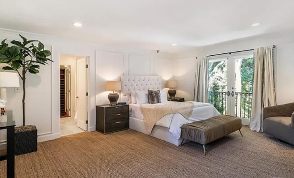 من جهةٍ ثانيةٍ، يكسو الموكيت أرضيَّة غرفة نوم النجمة؛ الغرفة ترتدي حلَّةً مُعاصرةً، من دون أن تتخلَّى عن الدفء. وهي تنعم بالسكينة المُتمثِّلة في الألوان الرائقة، وأبرزها البيج الذي يحضر على قطع الأثاث. وفي إحدى الزوايا، تبرز شتلة خضراء، ما يُضفي الحيويَّة على المساحة.