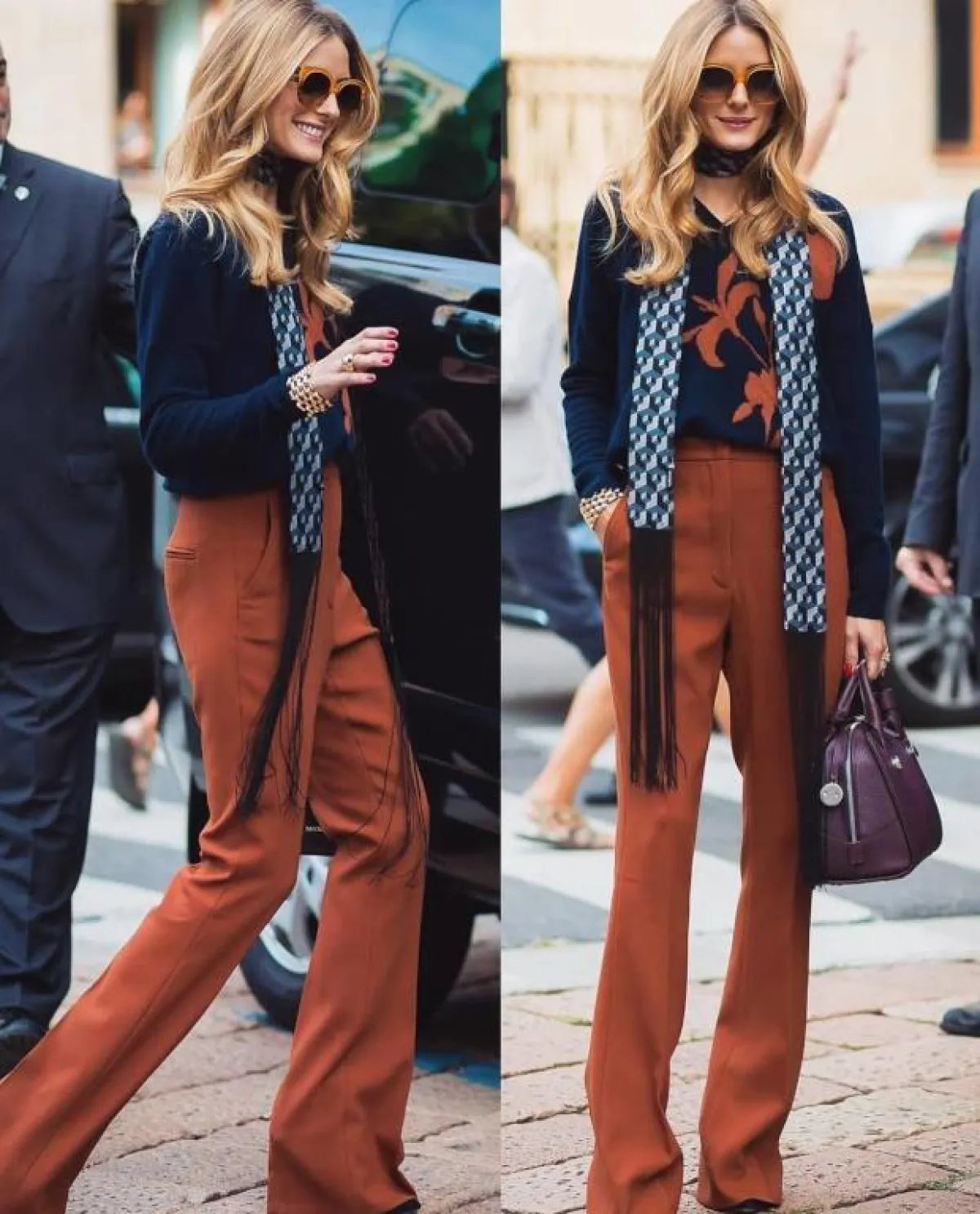 كذلك، ذهبت أوليفيا باليرمو، واحدة من أهم الشخصيات المؤثرة في عالم الموضة، إلى صيحة البنطلون نفسه المصمّم بأرجل فضفاضة، لكنها اختارت اللون الجملي المتوسط، ونسقته مع قميص نسائي كحلي.