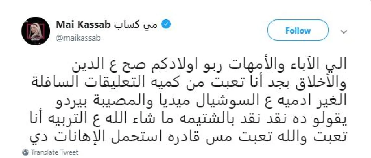 مي أكدت أنها تعبت من الرد على التعليقات التي تصل إلى حد السب والقذف، وغردت عبر حسابها الموثق بموقع تويتر قائلة: الى الآباء والأمهات ربو اولادكم صح ع الدين والأخلاق بجد أنا تعبت من كمية التعليقات السافلة الغير ادميه ع السوشيال ميديا والمصيبة بيردو يقولو ده نقد نقد بالشتيمه ما شاء الله ع التربية أنا تعبت والله تعبت مش قادره استحمل الإهانات دي.