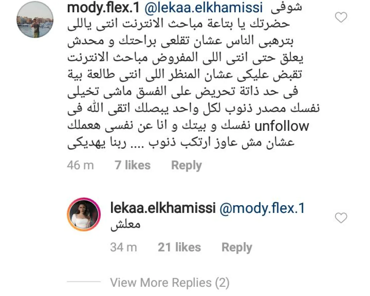 بعض المتابعين ظن أن التهديد مجرد حيلة من الخميسي لردعهم، وعلق أحدهم، بأن مباحث الانترنت يجب أن تقبض على لقاء نفسها وليس على من يكتب تعليقات مسيئة، لافتا إلى أن إطلالتها تنطوي تحت جنحة "الترويج على الفسق والفجور"، وأعلن أنه سيلغي متابعة الفنانة التي اكتفت بالرد عليه بكلمة "معلش"، ولكنها لم تتسامح مع متابع آخر أهان زوجها بسبب سماحه لها بالخروج بهذه الإطلالة ووصفه بكلمة مسيئة للغاية، فردت عليه الخميسي سريعا: مباحث الإنترنت حترد على حضرتك. في إشارة لتقديمها بلاغ رسمي.