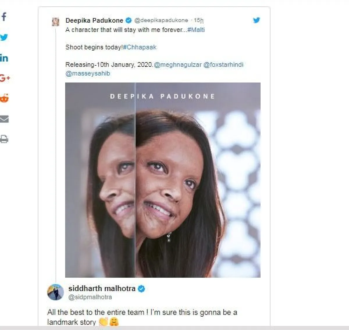 عادت نجمة بوليوود ديبيكا بادوكون Deepika Padukone بفيلم جديد بعنوان " Chhapaak بعد الابتعاد عن كواليس الأعمال السينمائية والأفلام لمدة عام، ، حيث يتناول الفيلم سيرة ذاتية لفتاة بوجه محروق ومشوه.
