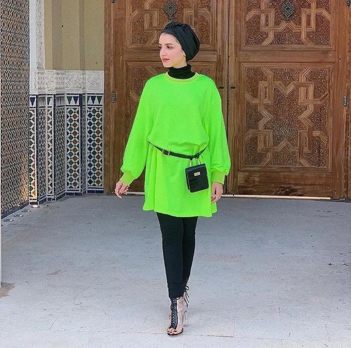 وبلمسة أخرى ملفتة، نجدها تعتمد على الألوان العصرية لهذا الصيف، للبلوزة النيون الخضراء، طويلة ومحتشمة، لهذا اختارت معها بنطلونا أسود ضيقا، مع حزام الخصر، وحذاء شفافا مفتوحا من الأمام، هذا اللوك أيضا مناسب للصبايا الممتلئات.