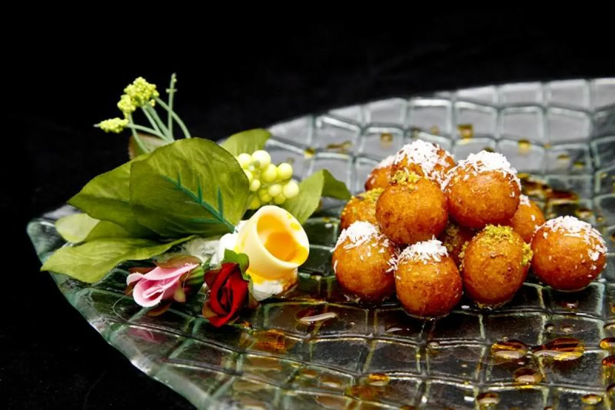 2- توضع الكرات في البرّاد لنصف ساعة.ثم، تسخّن مقلاة على النار تحتوي على زيت غزير، وتقلى هذه الحبّات حتى الاحمرار، ثم تغمس في القطر.