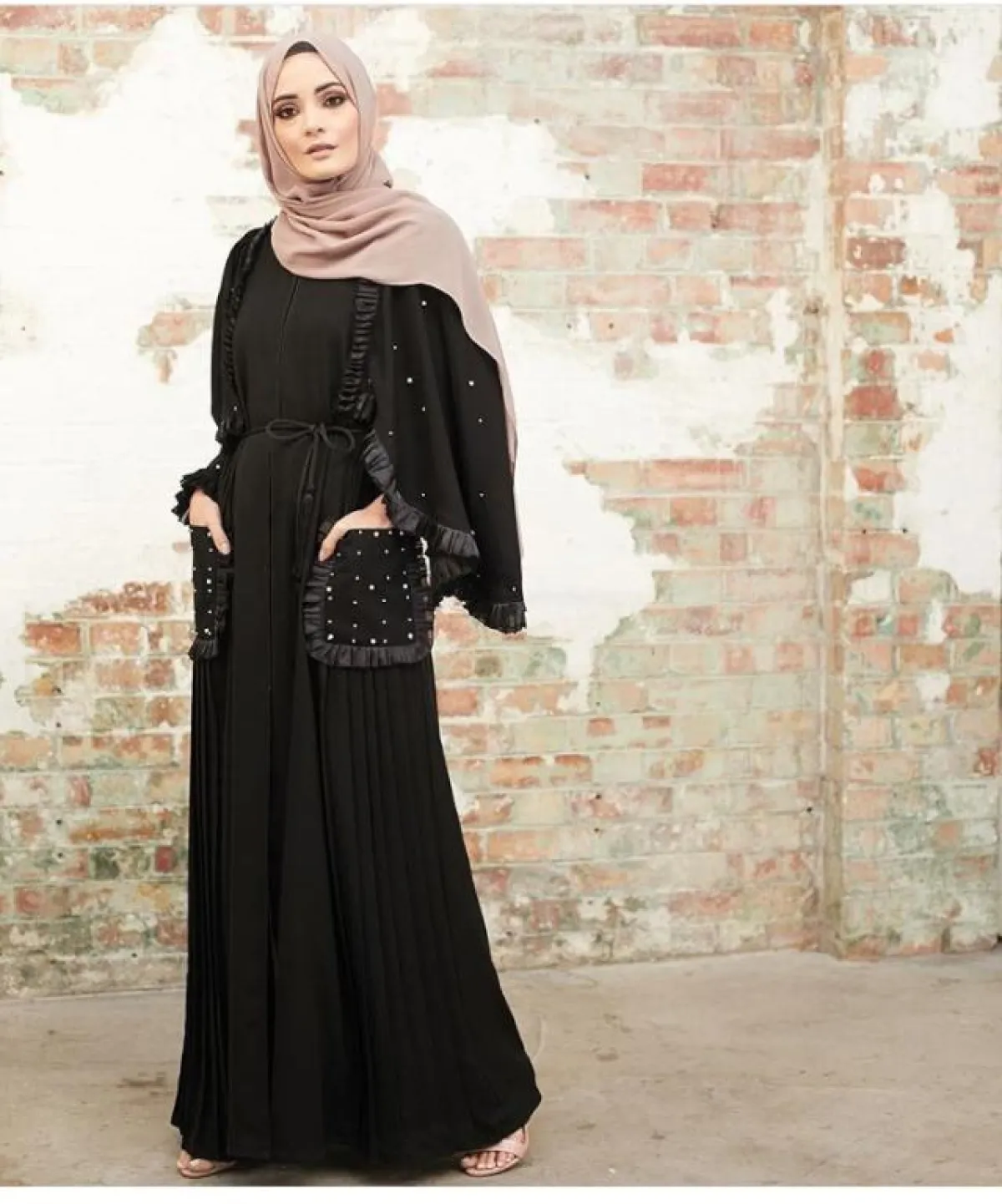 لفتنا تطريزات الورود السوداء على الأكتاف والأكمام للعباية من حسنة كولكشن Husna Collection، نسقيه مع حجاب بألوان النود، يضفي بعض اللمسات المخملية لاطلالتكِ، ويمكنكِ اعتماد الكعب العالي معه، أو الصنادل المفتوحة لاطلالة ربيعية أكثر.