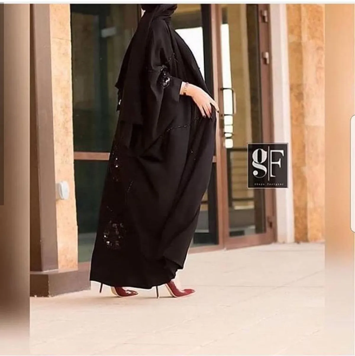 العبايات مع تصميم الفراشة، التي تكون أكمامها واسعة جدًّا، كجناحات الفراشة، وضيقة فقط من المعصم، كهذا الموديل من Gfabyah جي إف عبايه، من التصميمات المريحة، والتي يمكنكِ ارتداؤها بأيّ وقت، مع سنيكرز أبيض وجينز للجامعة، أو حذاء الميول باللون الأسود، وحجاب أبيض لاطلالة نهارية بسيطة.