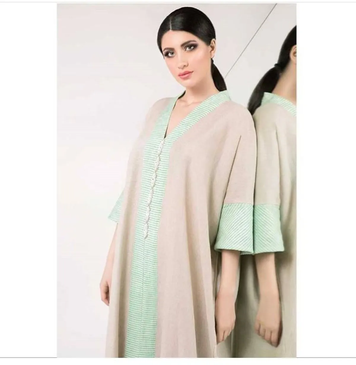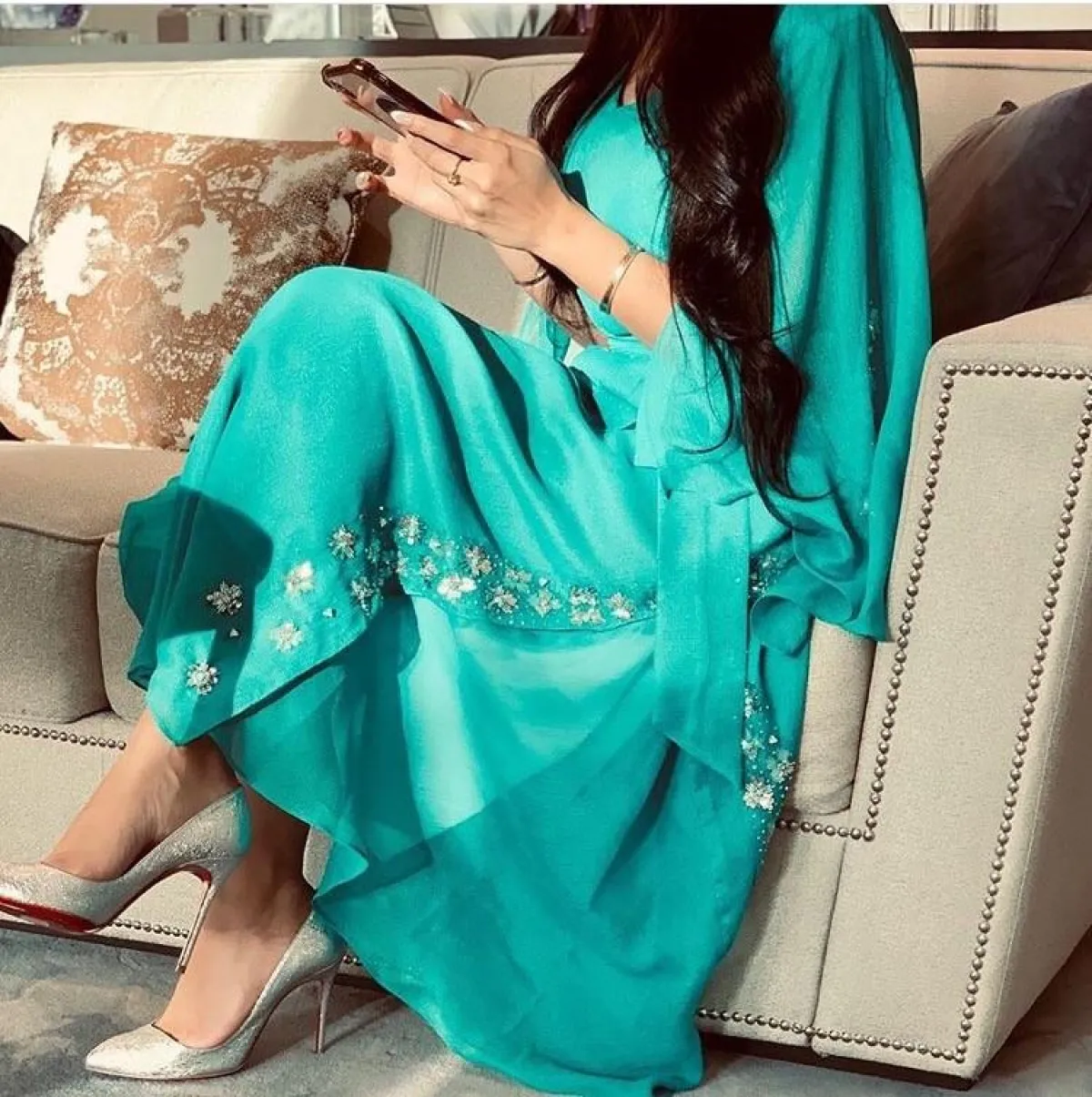 الألوان المبهجة سوف تتصدر القائمة بالعبايات، كالعباية التركواز بخامة الساتان الحريرية من Alamaria Designer الأماريا ديزاينر، من الممكن أن ترتديها مع كعب قصير بلمسة لامعة، أو إن كنتِ تفضلين اطلالة أكثر راحة، ارتدي الحذاء الفلات الخوص باللون البيج أو النود.