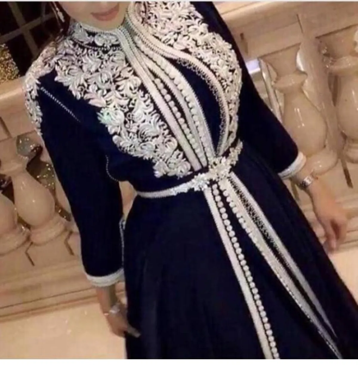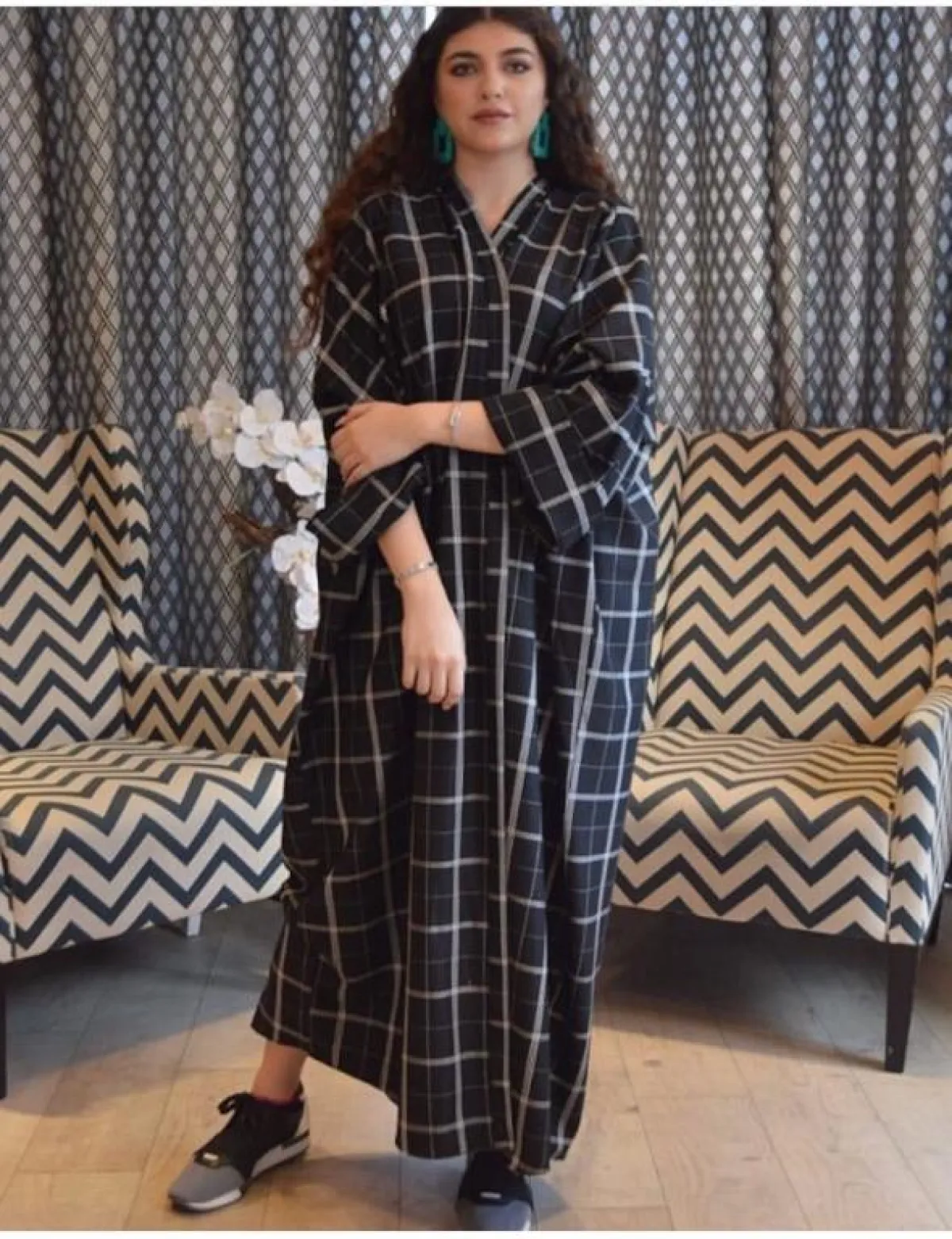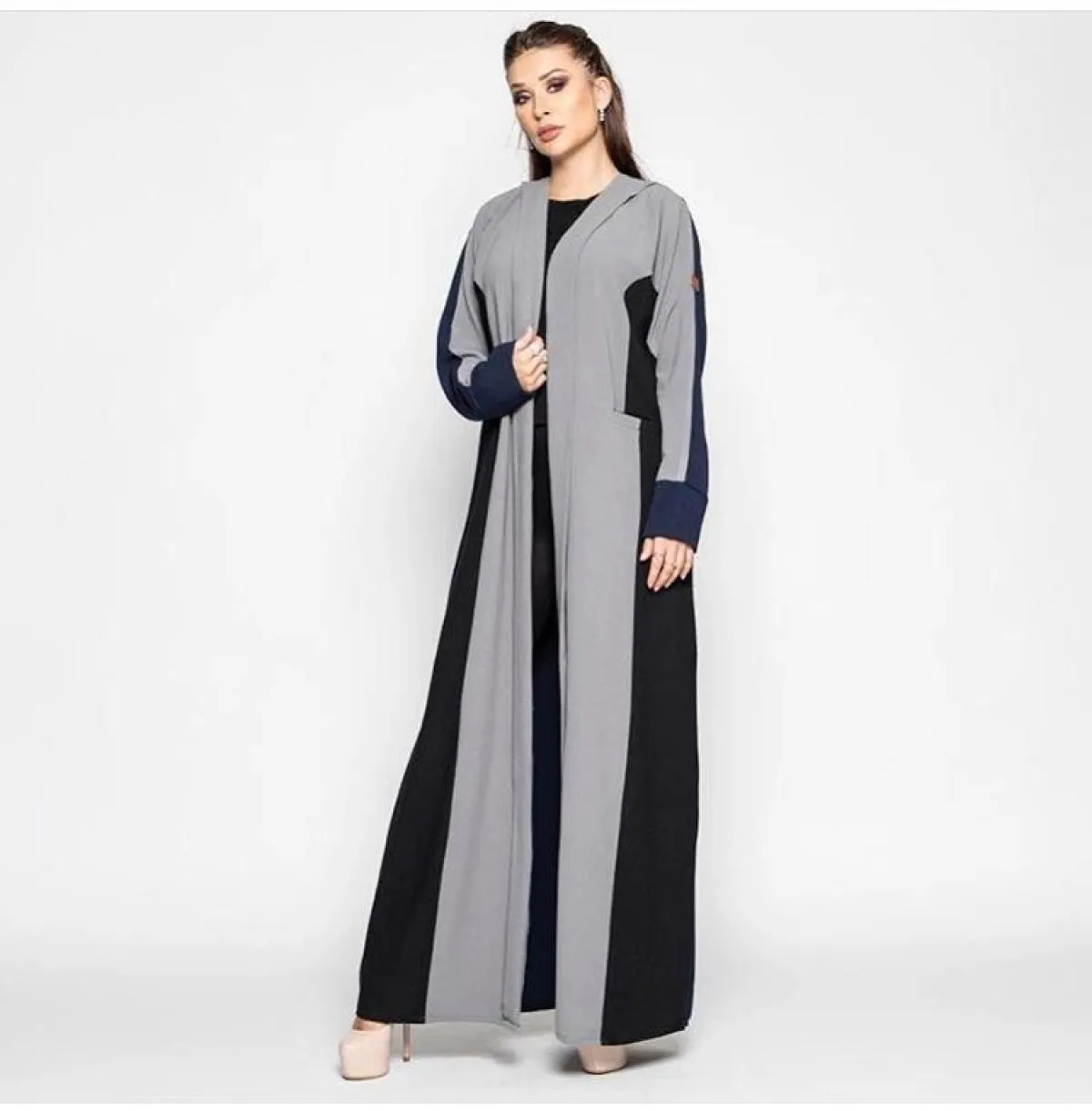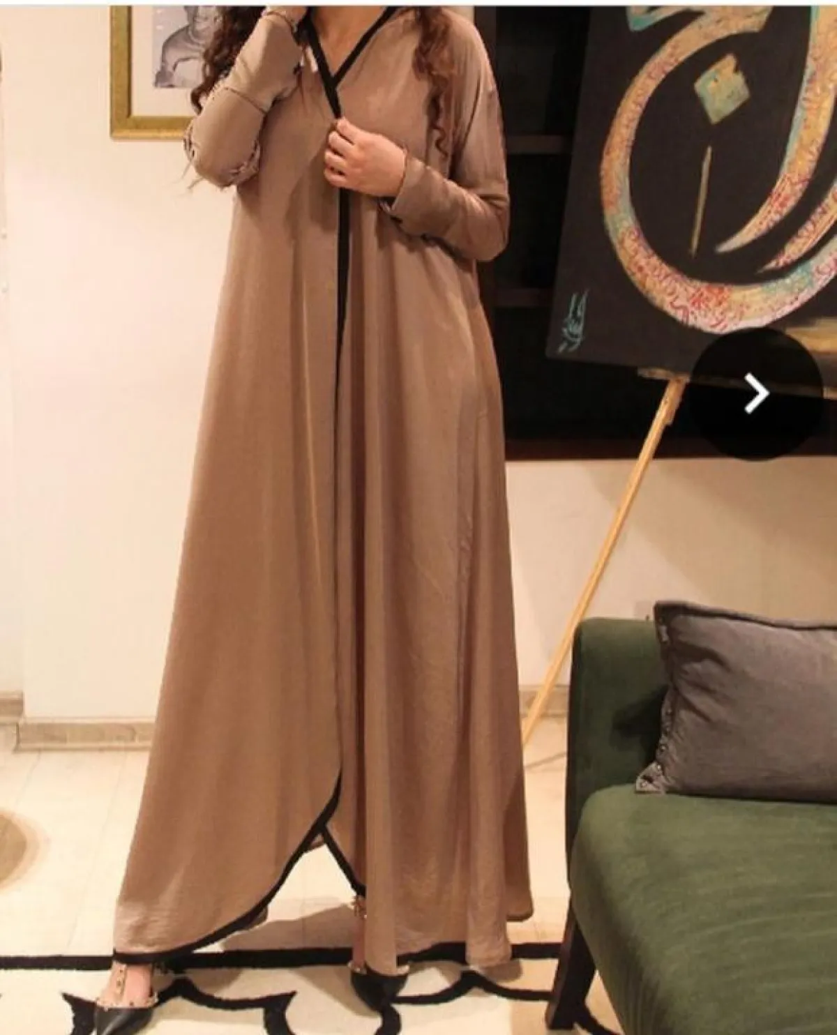 اختيار عبايات الاستقبال بالمنزل، لا يعني أن تكون غير أنيقة كالموديلات الأخرى، بالعكس من الممكن أن تكون غاية في الأنوثة والترف، كهذا التصميم من Hamdaqayed حمد أكاياد، مع حزام الخصر العريض، للصبيّة صاحبة الساعة الرملية، أو جيم الكمثرى، وننصحكِ باعتماد الكعب السميك أو القصير باللون الأبيض أو الذهبي، حتى تبدي أطول وأنحف، بخاصة مع خامة الساتان الحريرية للعباية، التي قد تُبرز بعض عيوب الجسم.