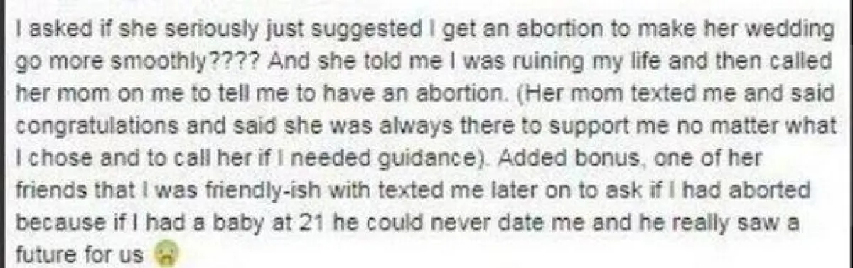 وذكرت أنها متزوجة من مدة ولا يوجد لديها أطفال، حتى أن الأطباء قالوا لها، أنها لا يمكنها الإنجاب، لكن قدر الله لها أن تحمل، لكنها عندما أخبرت صديقتها ثارت عليها وطلبت منها أن تجهض، لأنها لا تريد أطفالاً في زفافها، بالإضافة إلى أنها كيف سترتدي فستان الوصيفة، ثم قالت لها :«ألا تعتقدين أنه قد يكون من الأفضل لك الإجهاض؟».