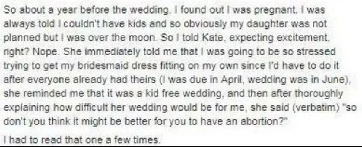 كشفت امرأة عن اللحظة المفجعة التي أخبرتها بها صديقتها العروس أن تجري عملية إجهاض قبل حضورها لحفل زفافها، لأنها ترغب بحفل زفاف خالي من الأطفال.