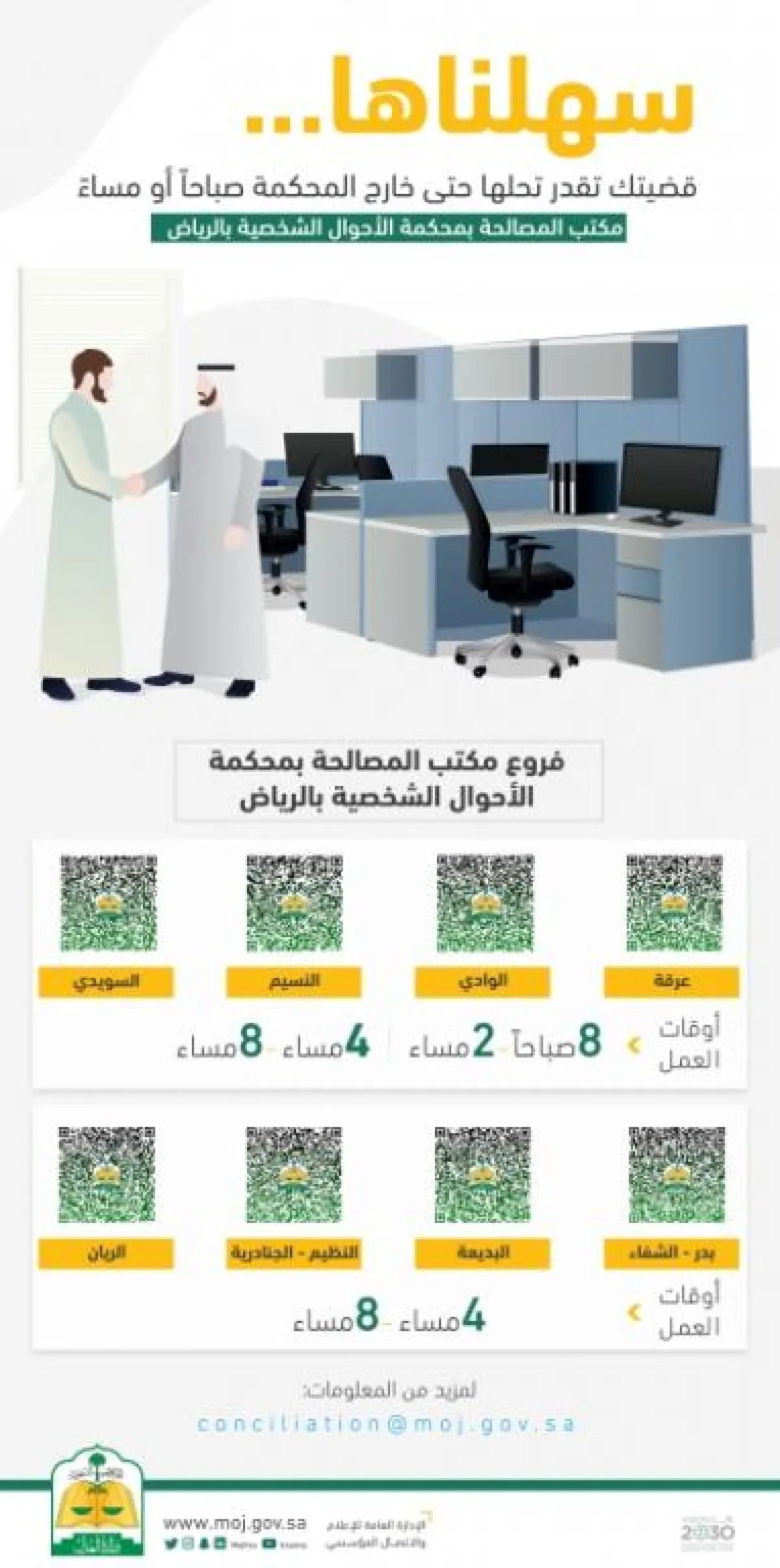 توسعت وزارة العدل في تفعيل مكاتب المصالحة عبر افتتاح ثماني مكاتب مصالحة منتشرة في أحياء مدينة الرياض، ترتبط مباشرة بالمركز الرئيس في محكمة الأحوال الشخصية بالرياض، بهدف تقديم الخدمة المستفيدين خارج أوقات الدوام الرسمي صباحاً ومساء وفي عدة أماكن تناسبهم.