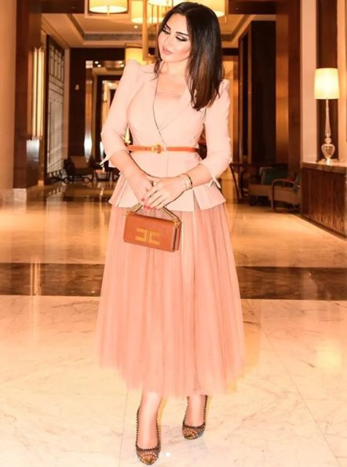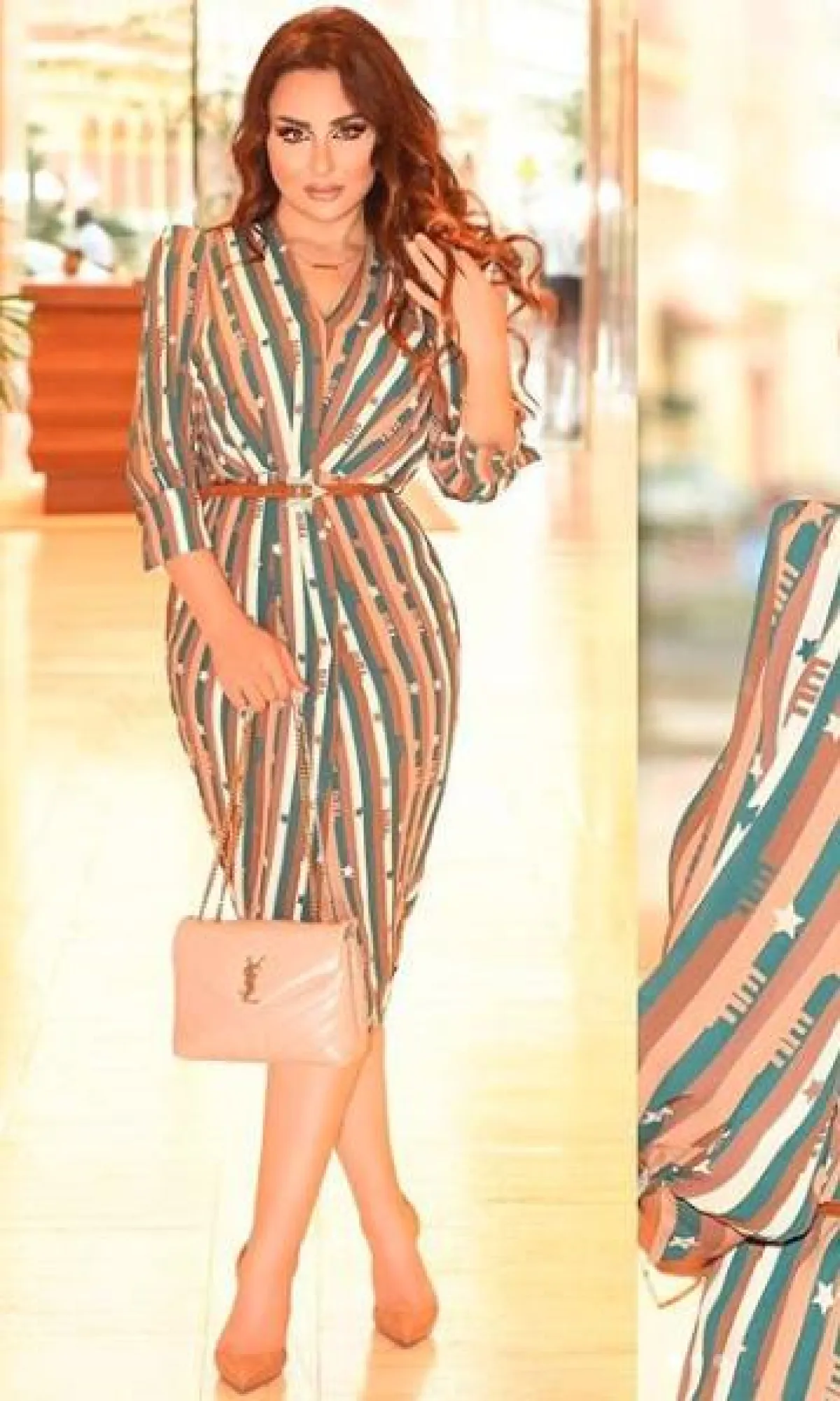 أيضًا شاهدنا سهير القيسي في إحدى المناسبات، وقد اختارت فستان ميدي معرقًا بدرجات ترابية ناعمة، زينت خصره بحزام رفيع من الجلد باللون البني، لتحدد تلك المنطقة بطريقة أنيقة، واختارت مع اللوك شنطة يد من الجلد باللون البيج من سانت لوران Saint Laurent، وحذاءً بكعب عالٍ.