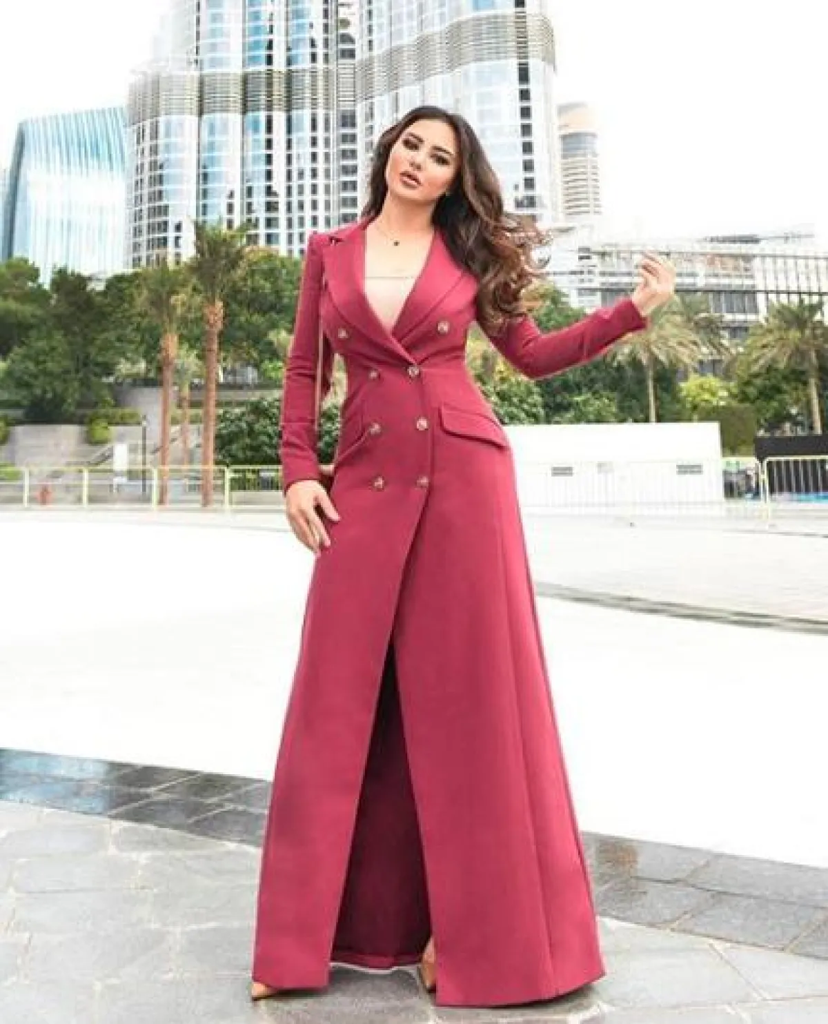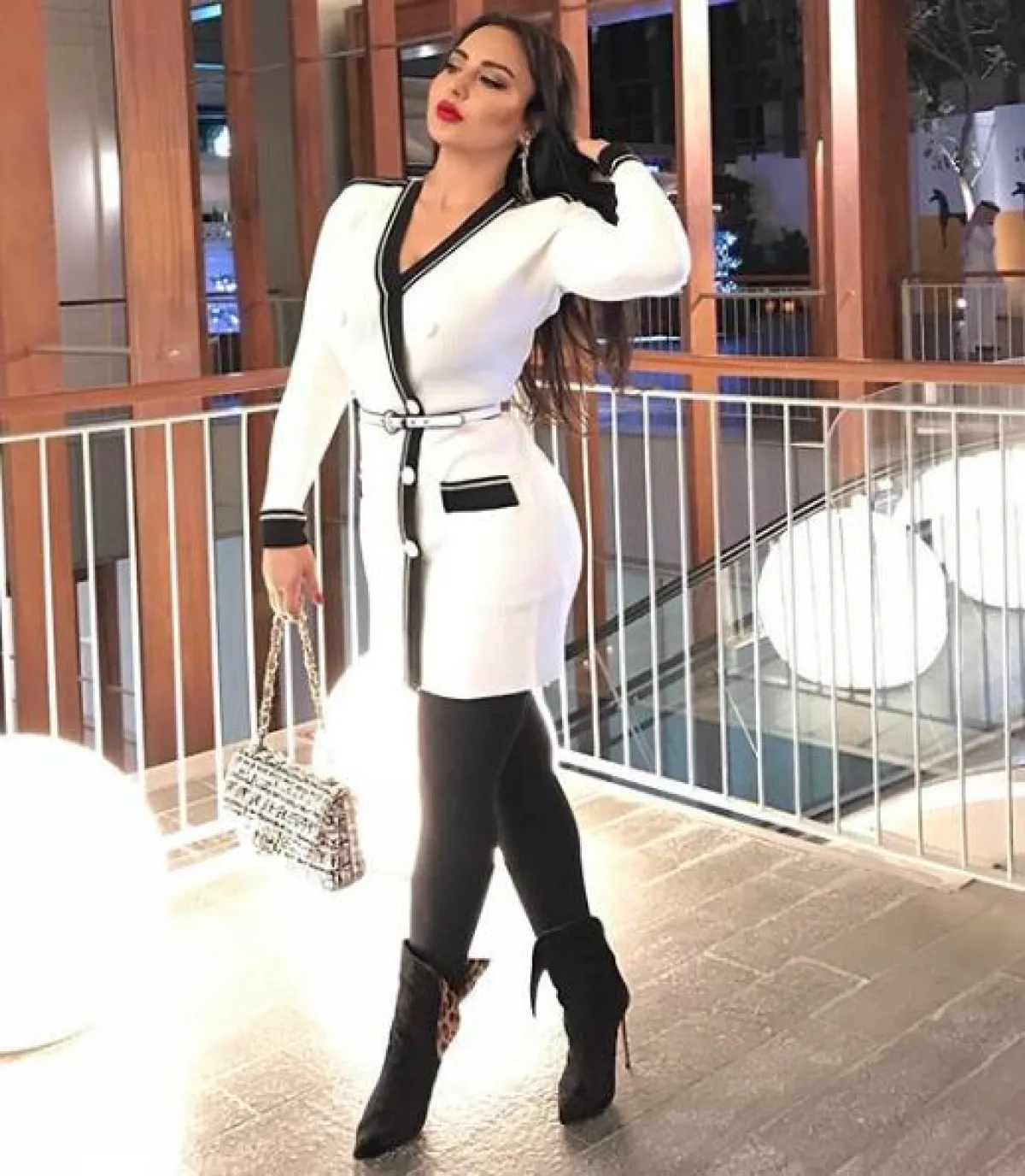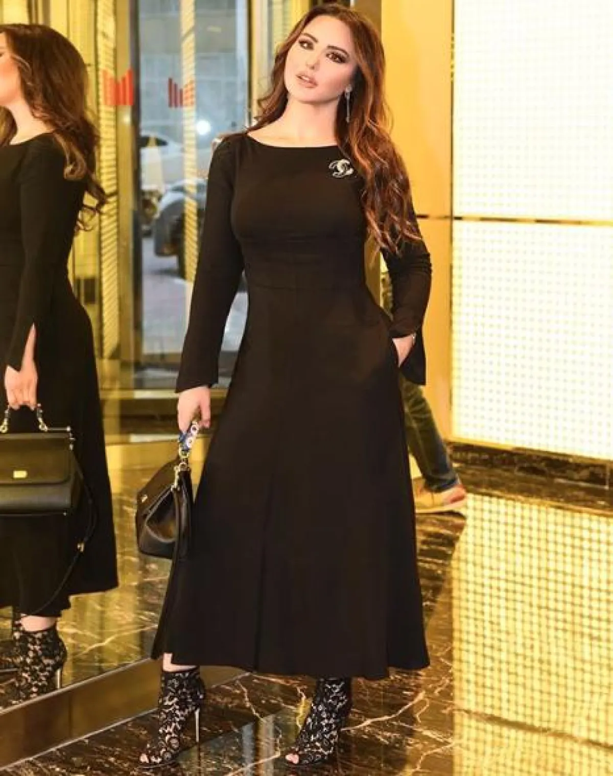 فساتين البليزر رائجة جدًّا هذا الموسم، وهي مثالية لتنحيف الخصر وبخاصة التصميمات المزينة بصفي أزرار، مثل الذي اختارته سهير القيسي باللون الأسود، وقد نسقت معه حقيبة كتف، وصندلًا بكعب عالٍ باللون الأسود.