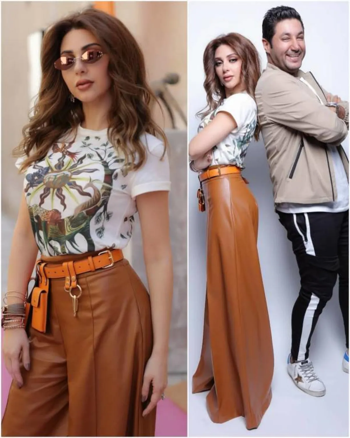ظهرت المغنية اللبنانية ميريام فارس في أحد اللقاءات التلفزيونية، باطلالة ربيعية عصرية، مزجت فيها بين الخامات المناسبة للطقس الحار وبين نفحة شتوية، ترجمتها في بنطلون جلد بأرجل فضفاضة، باللون الجملي الرائج هذا الموسم، ونسقته مع تي شيرت قطن مُطبّع برسوم عصرية، كذلك اعتمدت حقيبة الخصر المصممة من حافظات عدة متدلية.