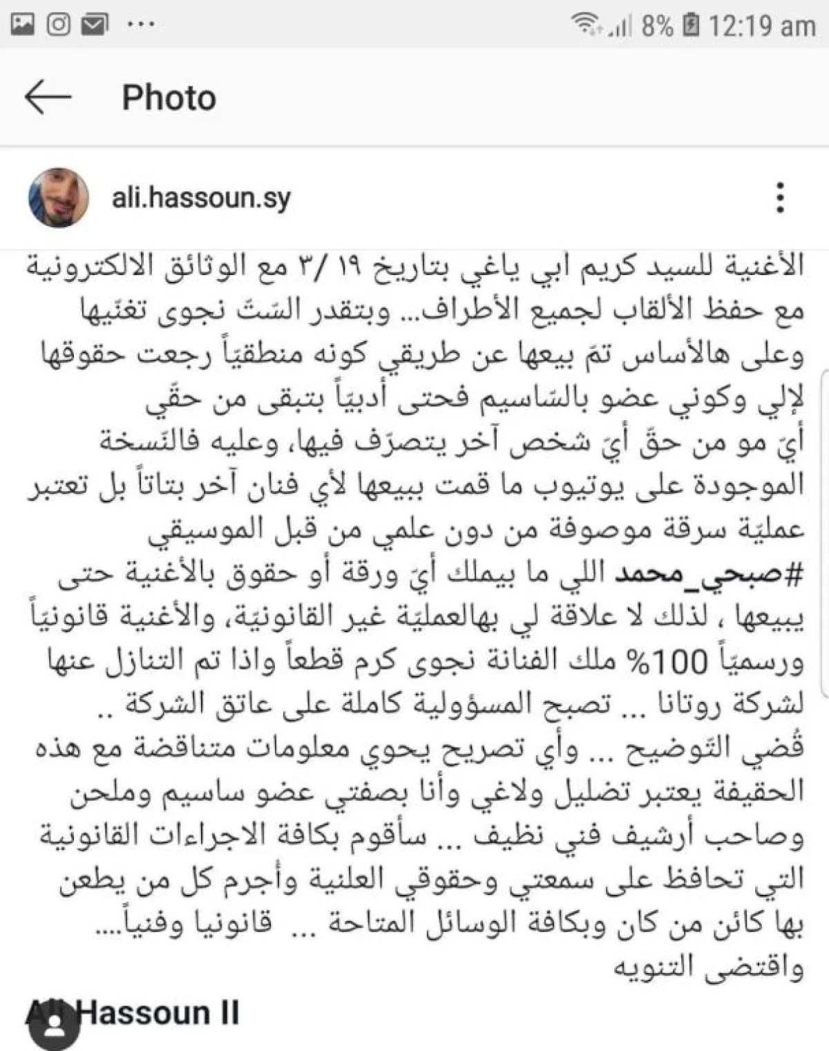 كما إتهم الشاعر حسون، الملحن أحمد صبحي بسرقة الأغنية وأنه لا يملك أي أوراق رسمية أو حقوق ببيعها، مؤكداً أنه لم يبعها لأي فنان آخر، ومضيفاً أنها هي من حق الفنانة نجوى كرم من الناحية القانونية، وفي حال تم التنازل عنها لشركة روتانا فعندها تقع المسؤولية على شركة "روتانا"، ومشيراً إلى انه سوف يقوم بكافة الإجراءات لحفظ حقه، خصوصاً وأنه عضو في الساسيم ولا يسمح بأن يتم تشويه إسمه.