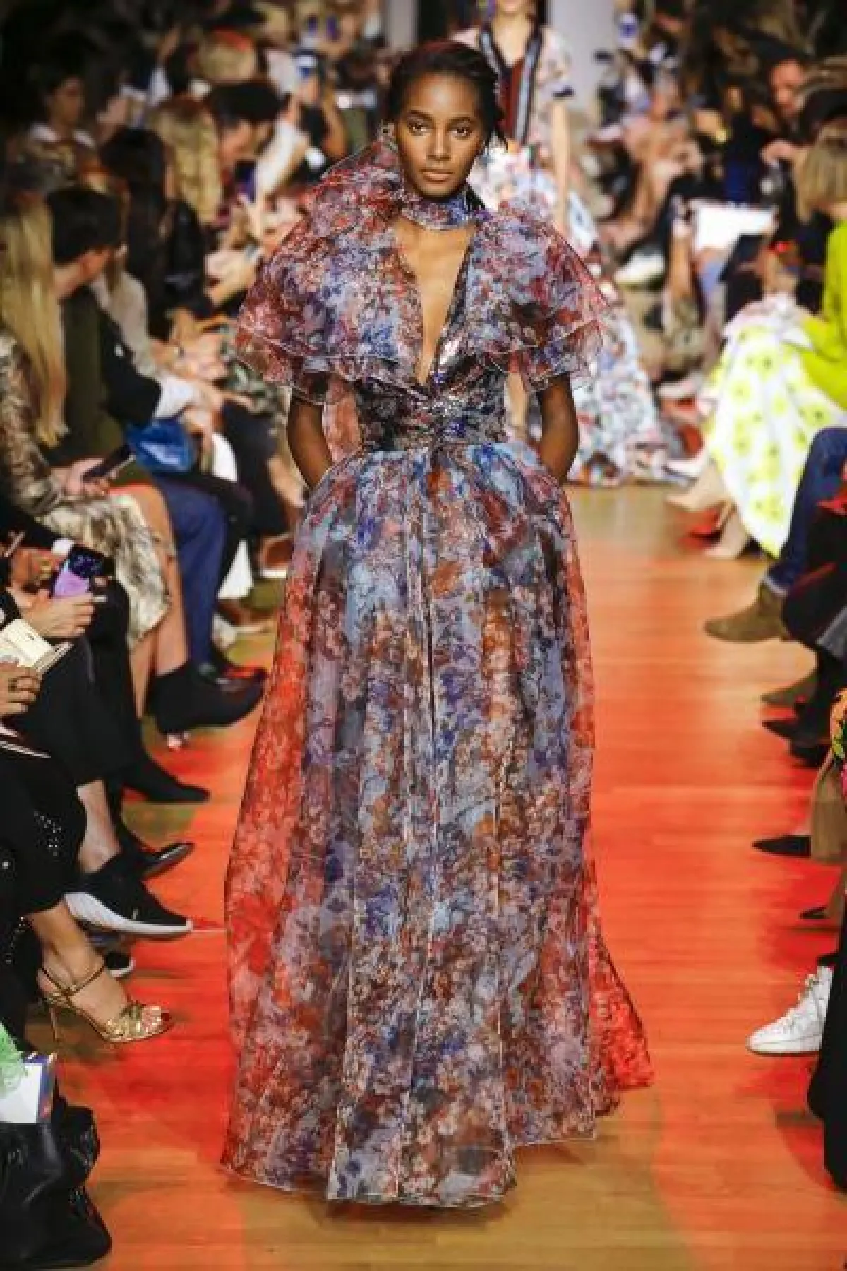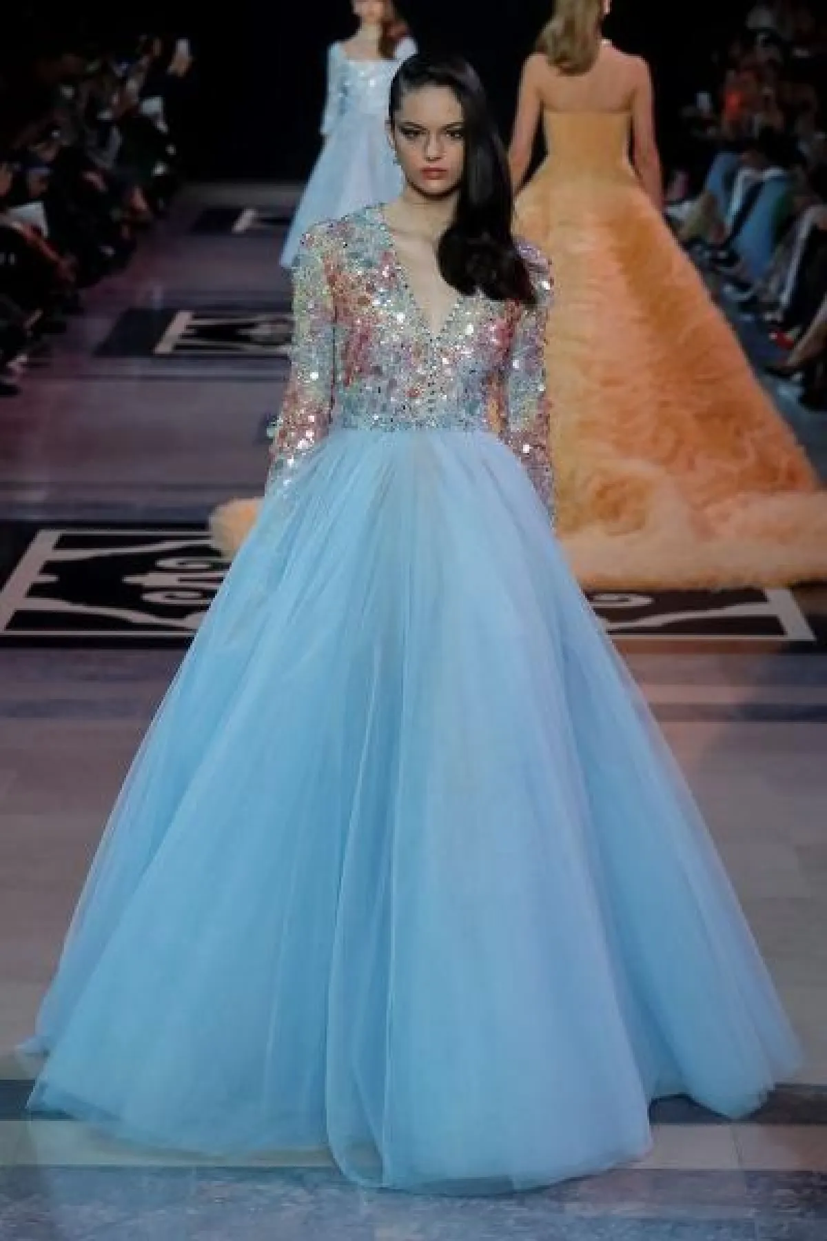 - حجزت فساتين السهرة المصممة بياقة حرف V لنفسها مكانًا ضمن إتجاهات موضة ربيع وصيف 2019، فتألقت بها عارضات جورج حبيقة Georges Hobeika خلال عروض الكوتور، كما لفتنا فستان بادجلي ميشكا Badgley Mischka الذي زين مجموعات الأزياء الجاهزة.