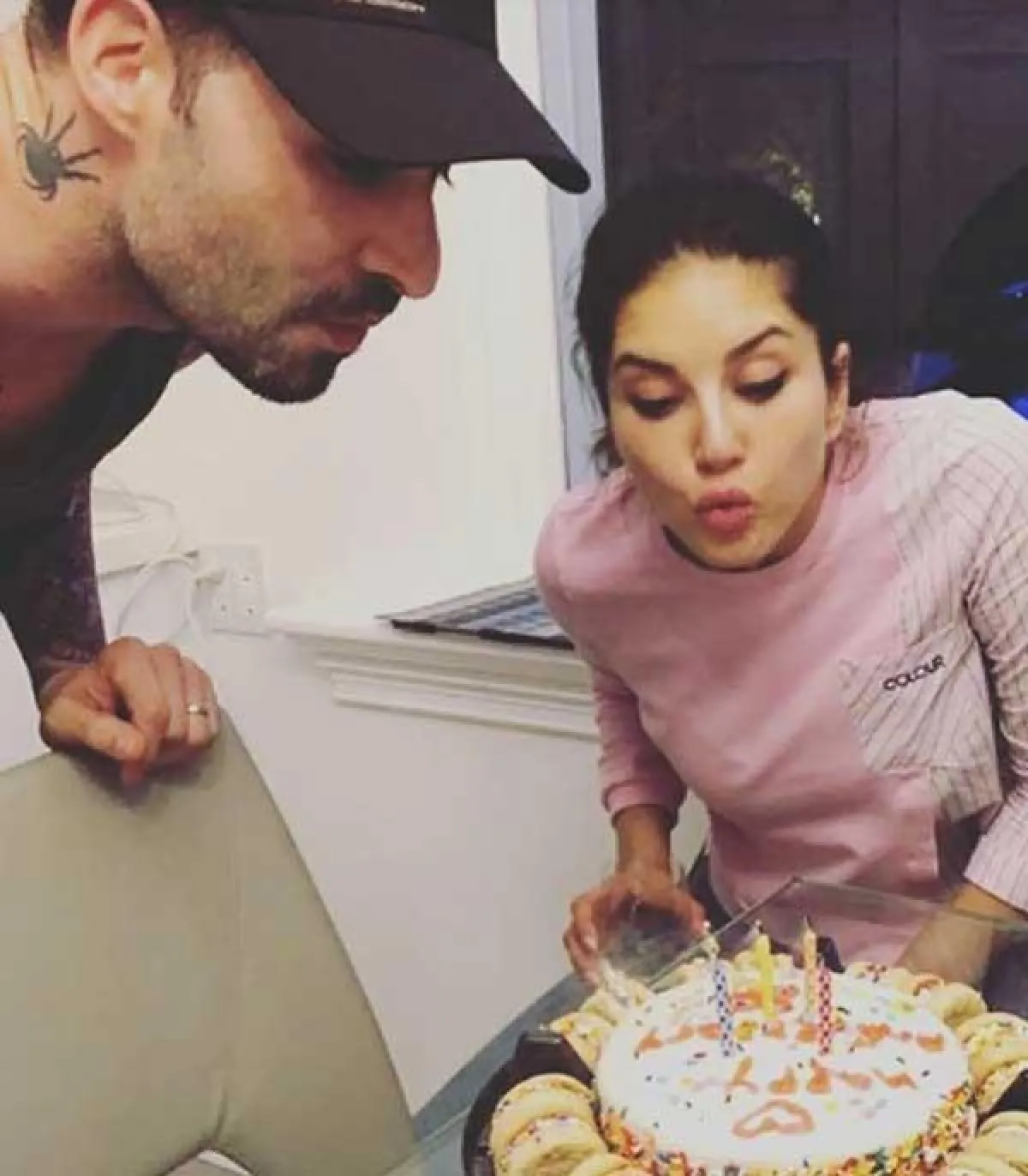 وتظهر ليون في الصورة وهي تقوم بإضاءة الشموع لزوجها دانيال، كما تبادل الزوجان قبلة في إحدى الصور وأمسكا بطفلتهما نيشا في أخرى.