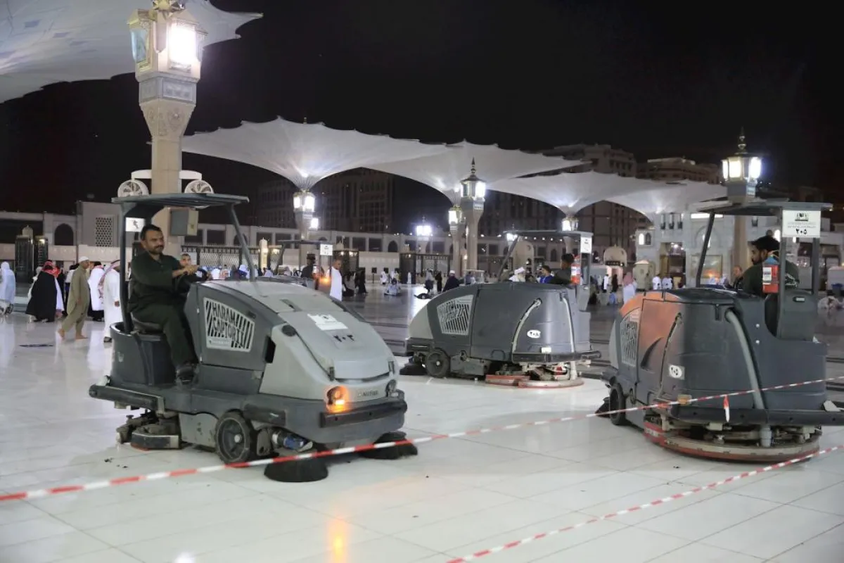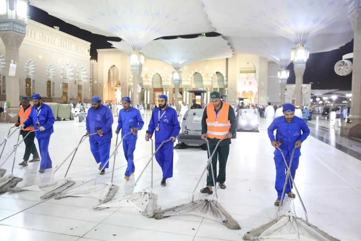 وعملت الوكالة على تكثيف الأعمال من خلال توزيع معدات الغسيل والبالغ عددها (٣٠) سيارة في جميع ساحات المسجد النبوي، لجمع الحشرات ورشها ثم التخلص منها وتواجد أكثر من (١٥٠) عامل في ساحات المسجد النبوي خلال وقت الذروة ( بعد صلاة العشاء) لتهافت الحشرات على الإنارة المنبعثة من المسجد النبوي خلال وقت الليل، وتزويدهم بالمعدات والمبيدات المخصصة لهذا الغرض ورش المناهل وقنوات التصريف وتعقيمها وتنظيفها من المخلفات أولاً بأول، من خلال مختصين مزودين بمضخات المبيدات الحشرية ورش براميل النفايات بالمبيدات بشكل متواصل وتعقيمها، وتجديد الأكياس لضمان عدم تجمع الحشرات عليها بالإضافة إلى تخصيص عمالة أمام أبواب الحرم القديم مزودين بـ ( ١٢) مكينة شفط، تعمل على شفط الحشرات والحيلولة دون دخولها للمسجد.