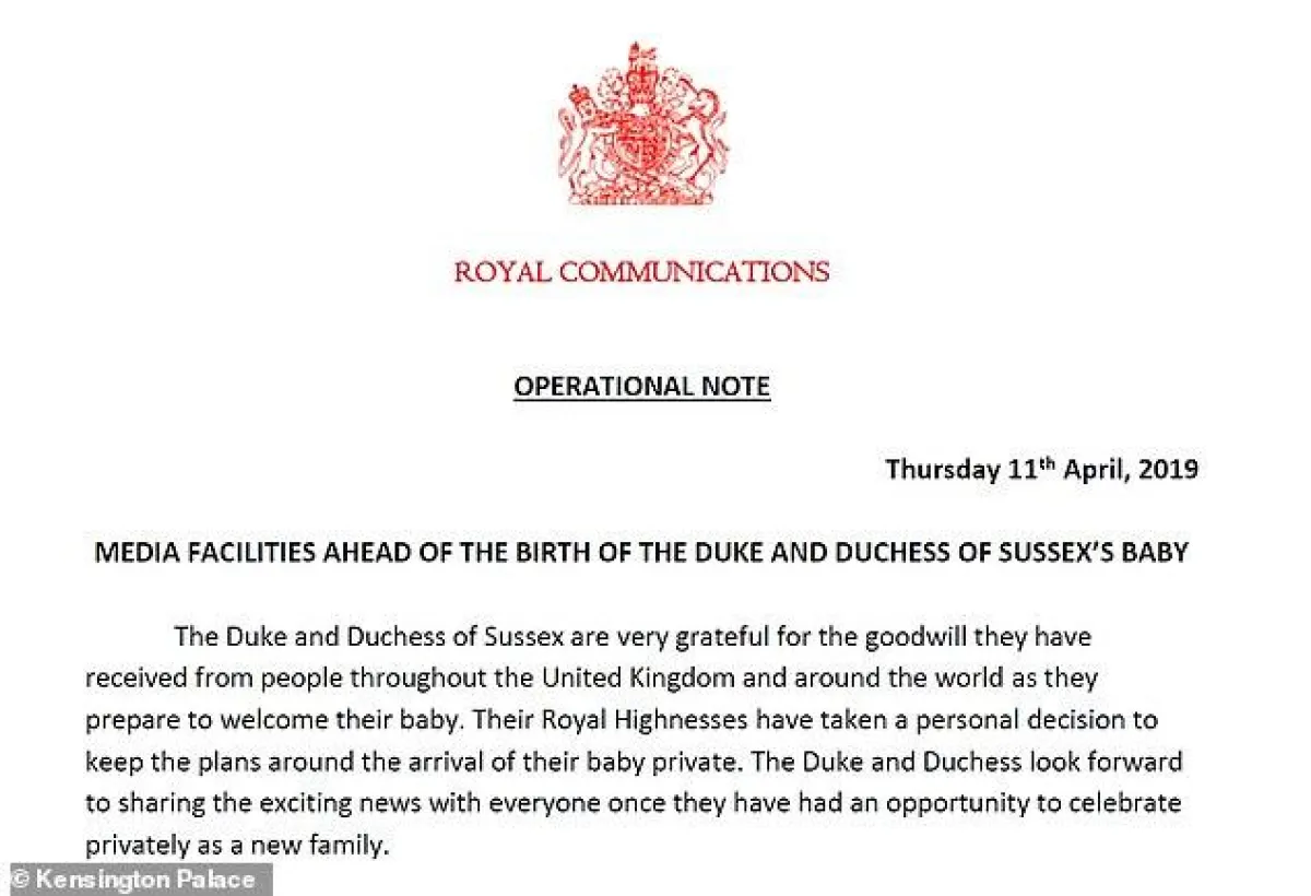 وقالا في بيان رسمي مشترك: «يعبر دوق ودوقة ساسيكس عن بالغ الامتنان للأمنيات الطيبة التي تلقياها من الناس في أنحاء بريطانيا والعالم فيما يستعدان لاستقبال طفلهما»، بحسب وكالة: «رويترز»، وأضاف البيان: «اتخذ سموهما قرارًا شخصيًا بالحفاظ على سرية الخطط المتعلقة بميلاد طفلهما».