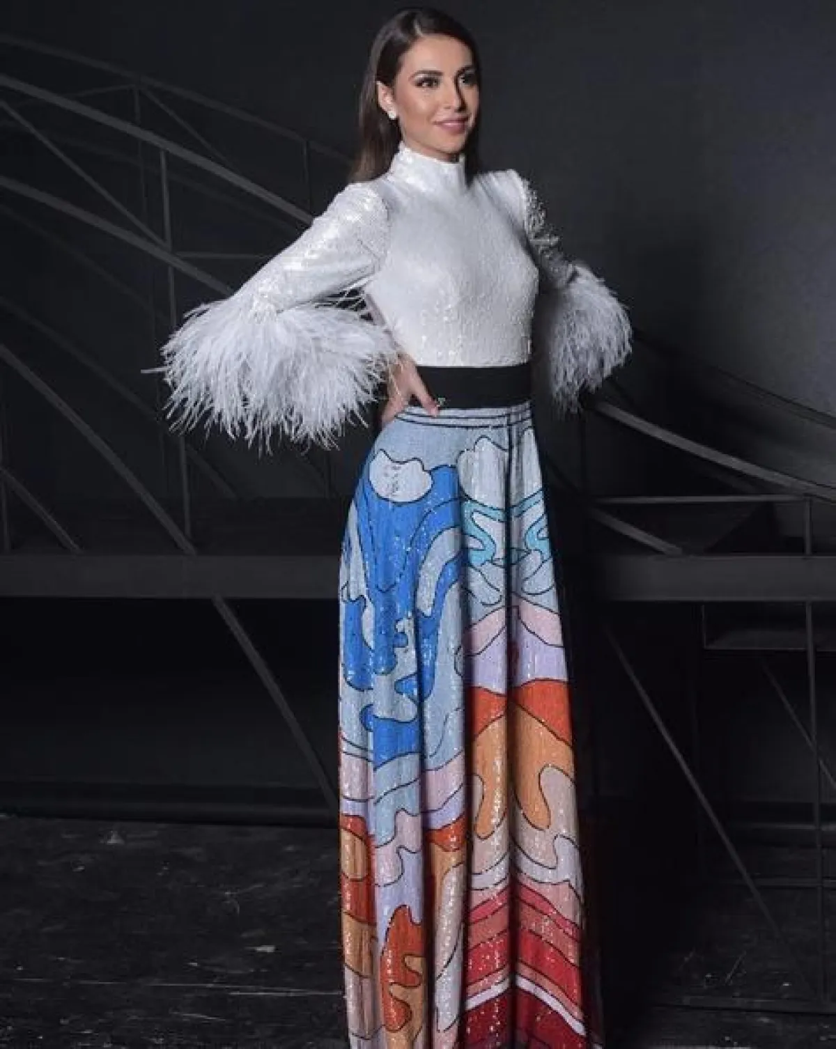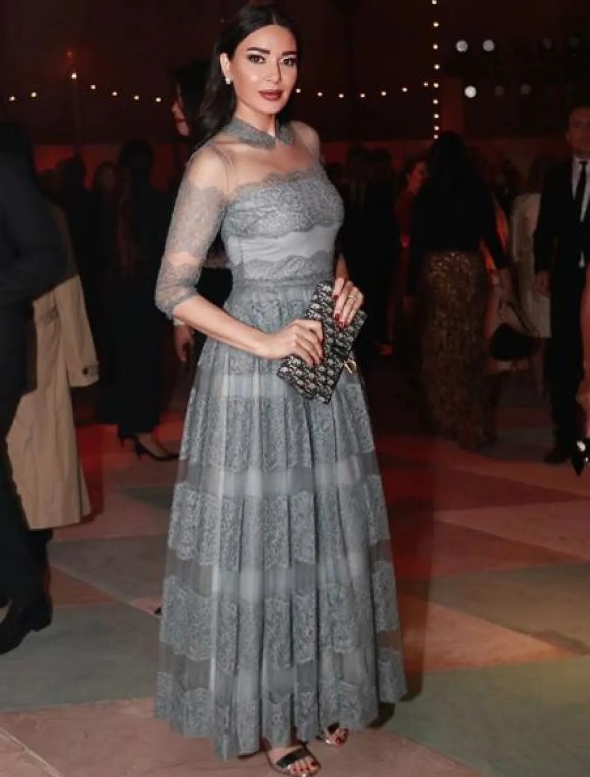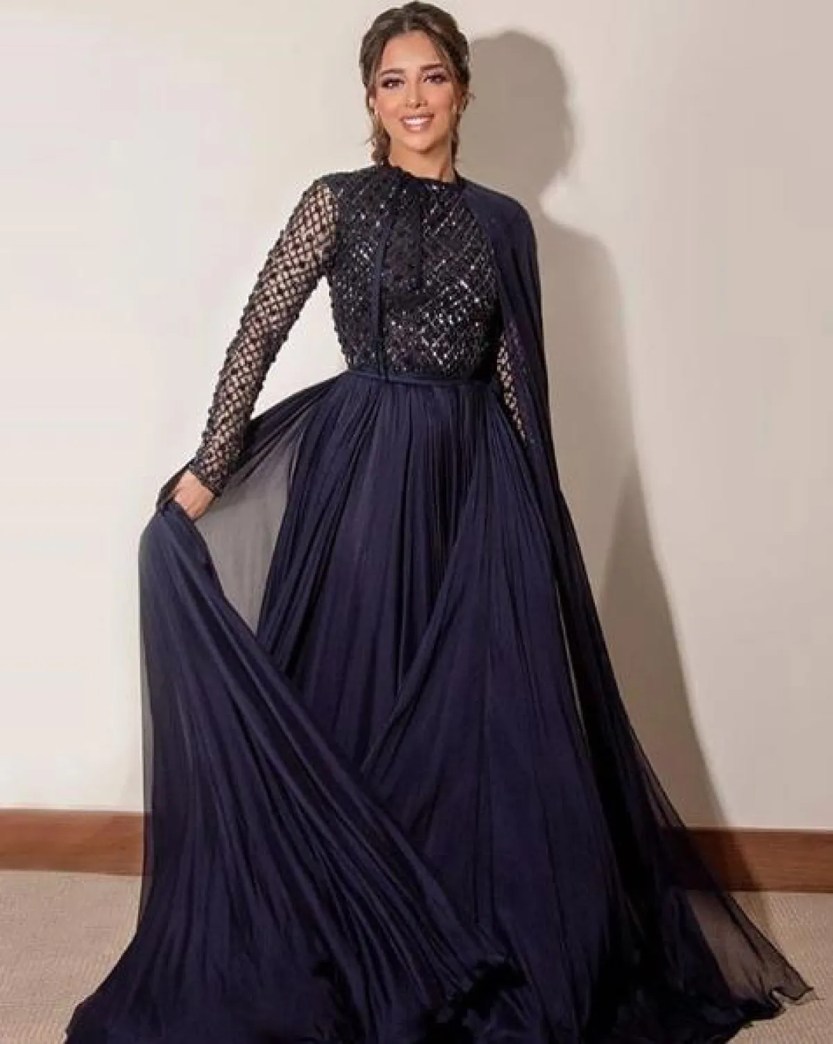 من المعروف عن بلقيس فتحي خياراتها الراقية والمحتشمة ولاسيما في فساتين السهرة، ومنها هذه الاطلالة التي اختارت فيها فستان سهرة مميزًا باللون الكحلي، بأكمام طويلة وتنورة منسدلة، القماش من الأعلى يبدو مثل الشبك البراق، أما التنورة من الموسلين المرهف وقد بدت فيه غاية في الأناقة والنعومة.