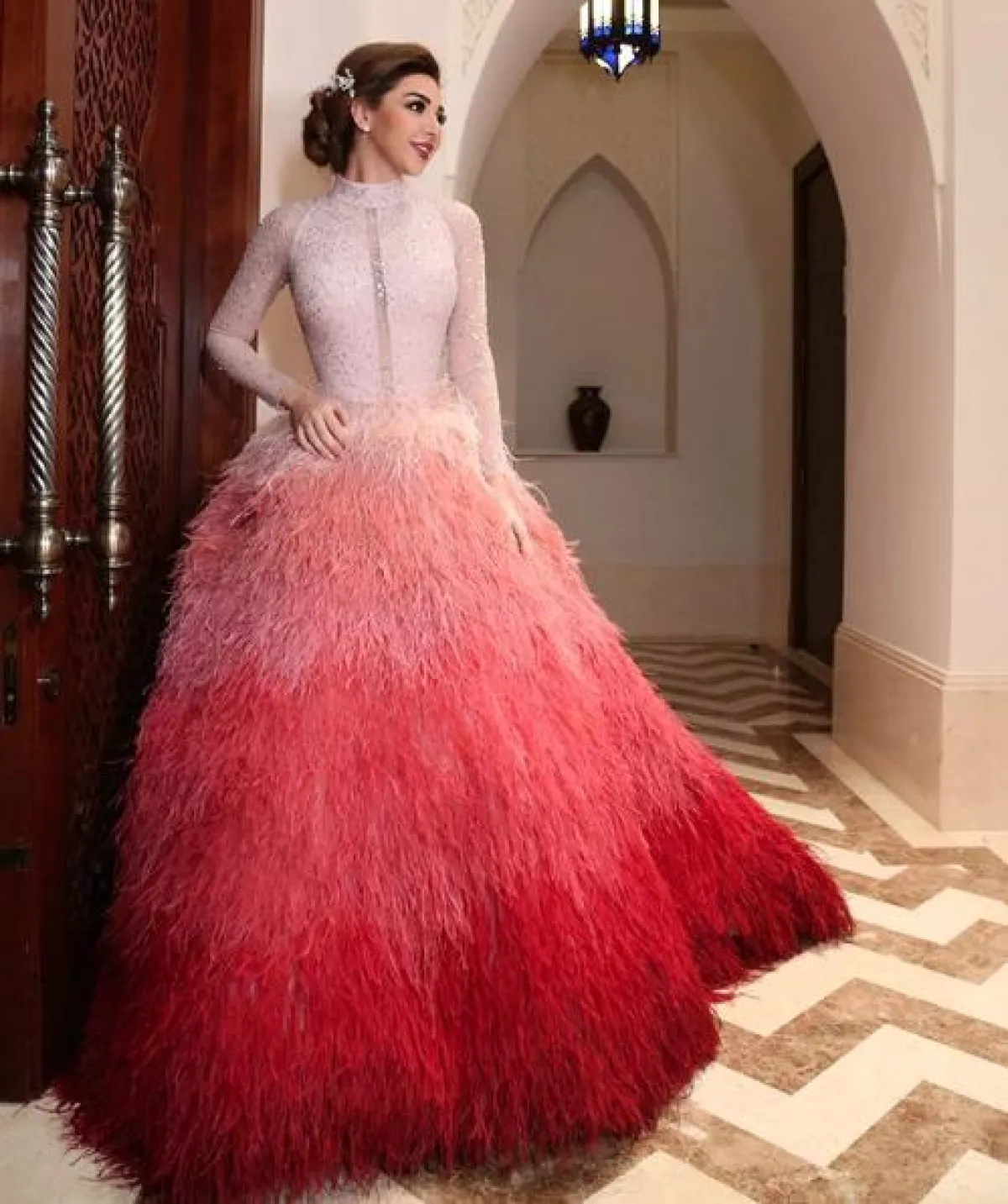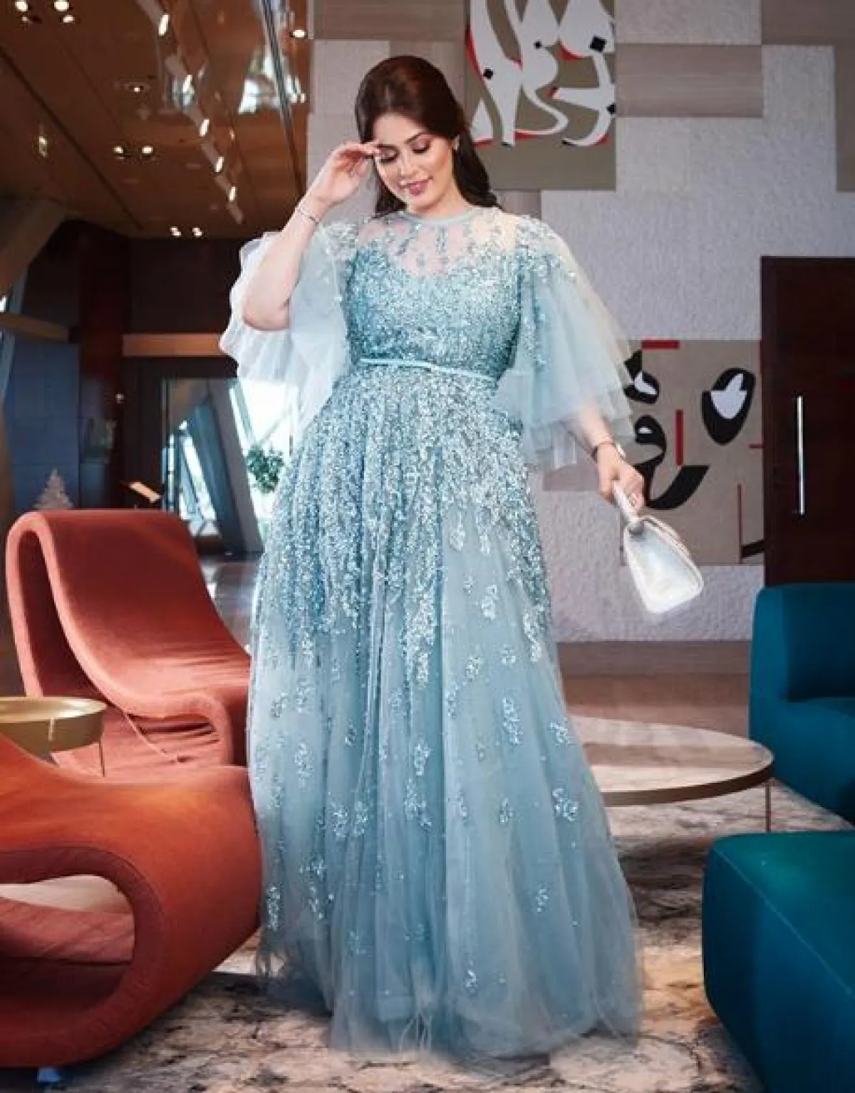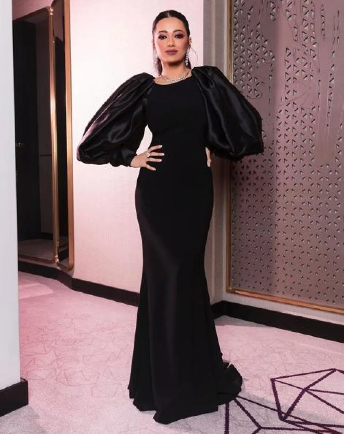 شاهدنا رحمة رياض مؤخرًا في اطلالة مميزة في فستان السهرة محتشم وعصري في الوقت ذاته، حيث إنّ تصميم الفستان مبتكر ولاسيما من ناحية الأكمام المنفوخة، قصته ناعمة حيث إنه محدد الخصر وتنورته منسدلة، وقد زينته ببعض المجوهرات الماسية.