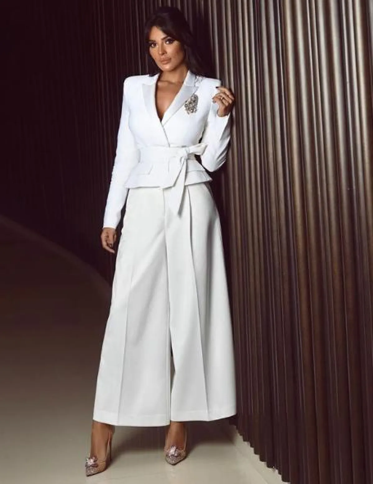 بالرغم من أنّ ياسمين صبري لم تختر فستان سهرة على السجادة الحمراء مؤخرًا، غير أنها تألقت في تصميم فاخر ومحتشم، كان عبارة عن جمبسوت باللون الأبيض حمل توقيع “أنطوان قارح” Antoine Kareh، نسقت من تحته قميصًا أبيض وربطة عنق، وأكملت اللوك باكسسوارات باللون الأسود، وقد بدت عصرية وأنيقة.