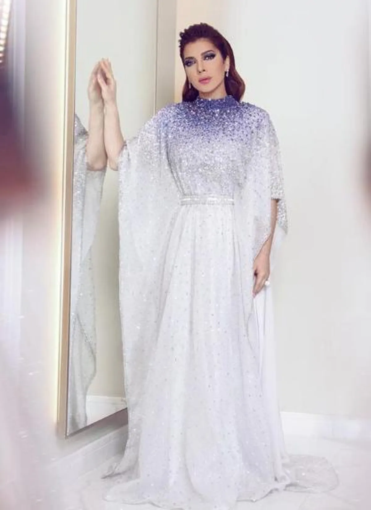 شاهدنا اصالة نصري مؤخرًا، وقد اختارت اطلالة فاخرة في فستان من الترتر البراق من “لابورجوازي” Labourjoisie بقماش متدرج بألوان البنفسجي الناعمة، وبقصة تشبه القفطان مع أكمام واسعة وحزام على الخصر، وقد اختارت معه مجوهرات ماسية أنيقة.