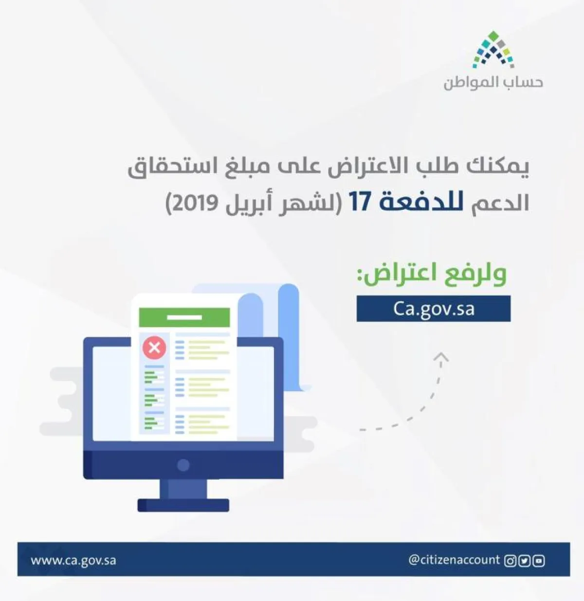 أعلن برنامج "حساب المواطن"، عن بدء استقبال طلبات الاعتراض على مبلغ استحقاق الدعم للدفعة الـ17 لشهر أبريل 2019، لمن لديه اعتراض على قيمة الدعم المقدم له.