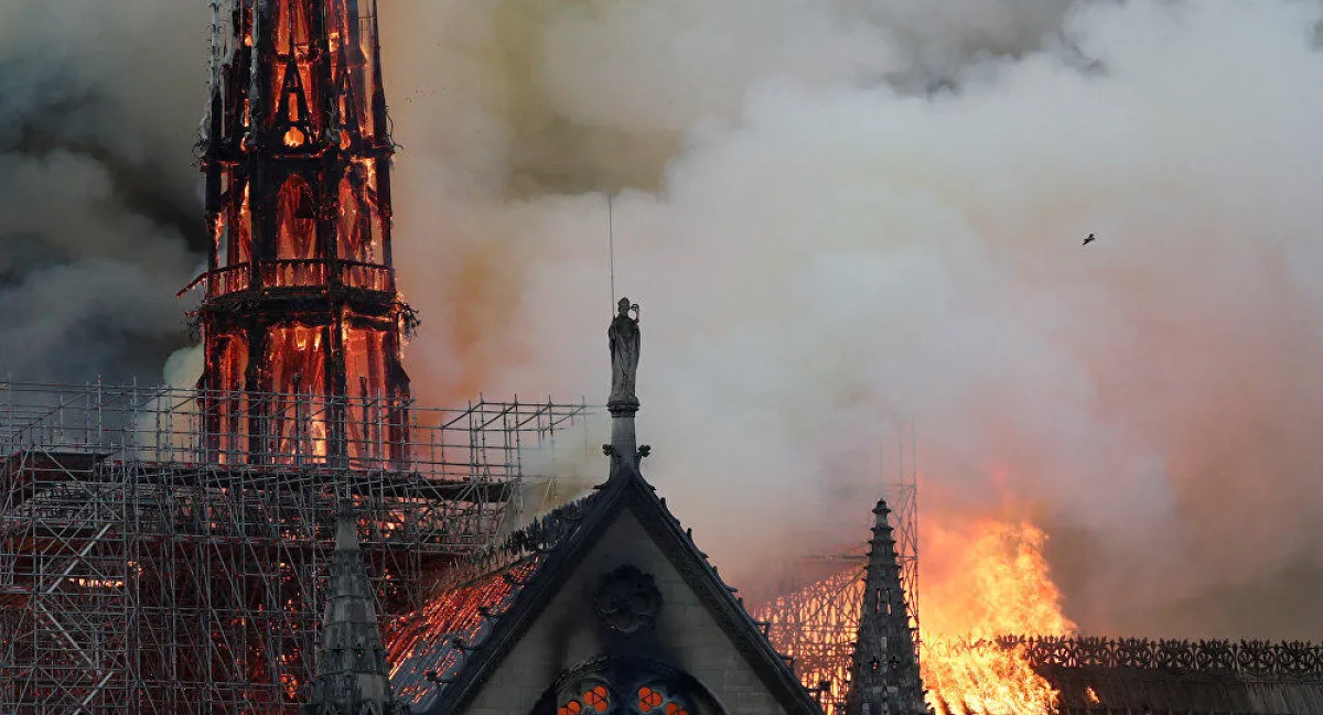 ولم يعرف حتى الساعة أسباب الحريق، الذي اندلع قبيل الساعة السابعة مساءً، وقد أدّت النيران إلى انهيار برج الكاتدرائية القوطية التي شيدت بين القرنين الثاني عشر والرابع عشر والبالغ ارتفاعه 93 متراً، إضافة إلى سقف الكاتدرائية.