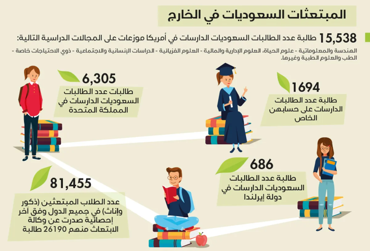 شهدت سنة 2018 ازدياداً لافتاً في عدد المبتعثات السعوديات إلى الخارج، وإلى مختلف البلدان والجامعات العريقة، لاستكمال دراساتهن في مختلف التخصصات، حيث شكلن نحو ثلث الطلاب المبتعثين بشكل عام.. وبلغ عدد المبتعثات إلى الولايات المتحدة الأمريكية وحدها 15538 مبتعثة.. وذلك بحسب وكالة وزارة التعليم لشؤون الابتعاث.