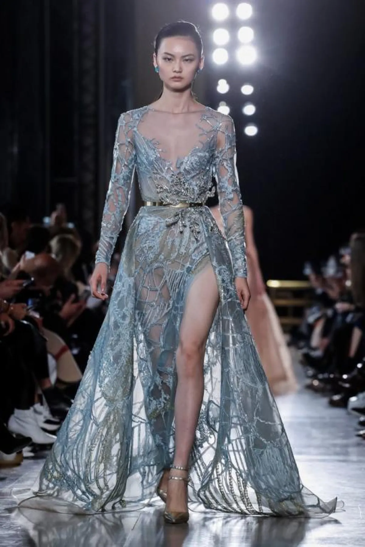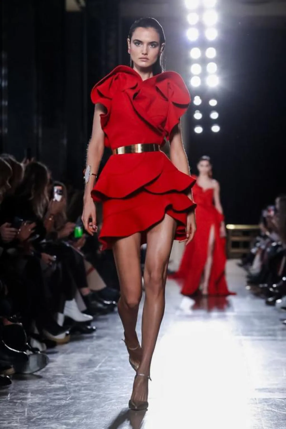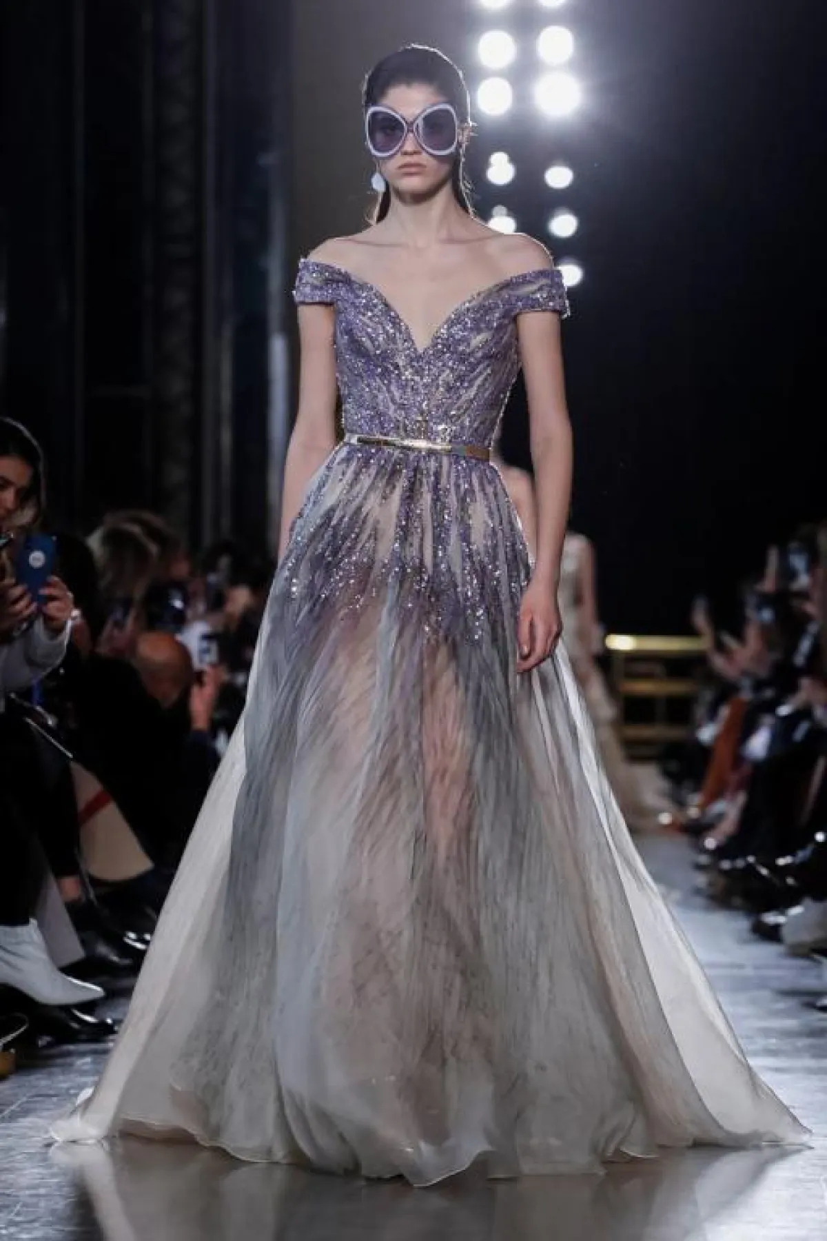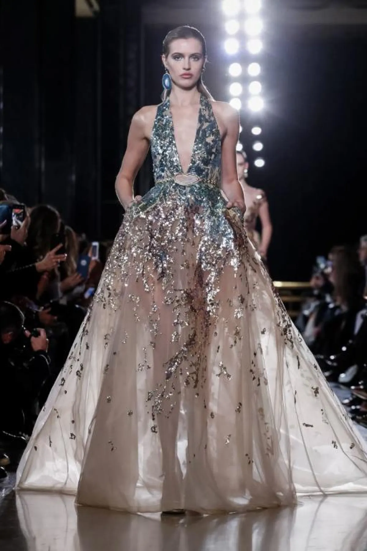 الفساتين القصيرة من الأمام مع الذيل الطويل، وحزام الخصر، من التصميمات التي تحبها الصبايا بحفل الخطوبة، فتمنحها اطلالة جريئة، وطولًا مضاعفًا، كالفستان من إيلي صعب Elie Saab، نسقي معها حذاءً مخمليًّا أو ميتالك، لتكوني أنتِ نجمة الحفل بالفعل.