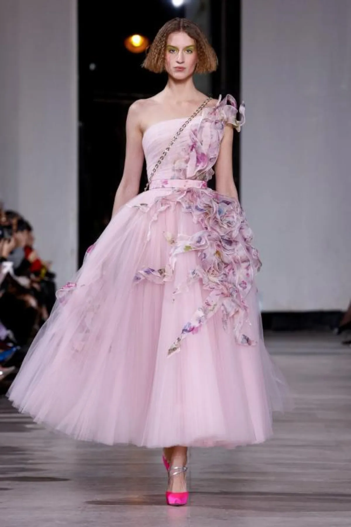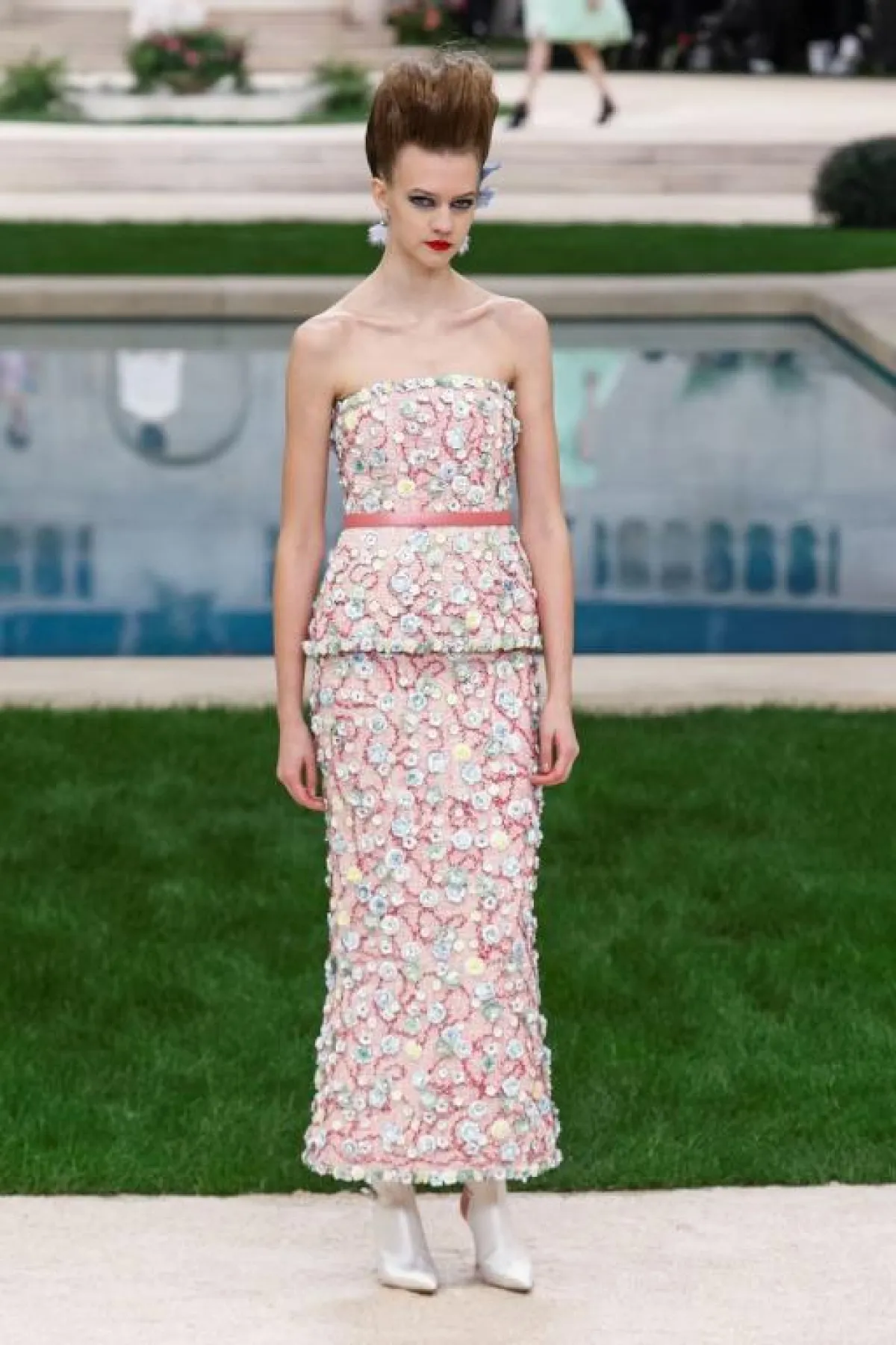 أما إذا كنتِ تحبين تصميمات أكثر بساطة غير منفوشة، فهذا الفستان من شانيل Chanel مع حزام الخصر الرفيع، وثنْيَة متدرجة من بعد الخصر، قد يزيدكِ طولًا، مع رسومات الورود، ولكنه مناسب أكثر للصبيّة النحيفة.