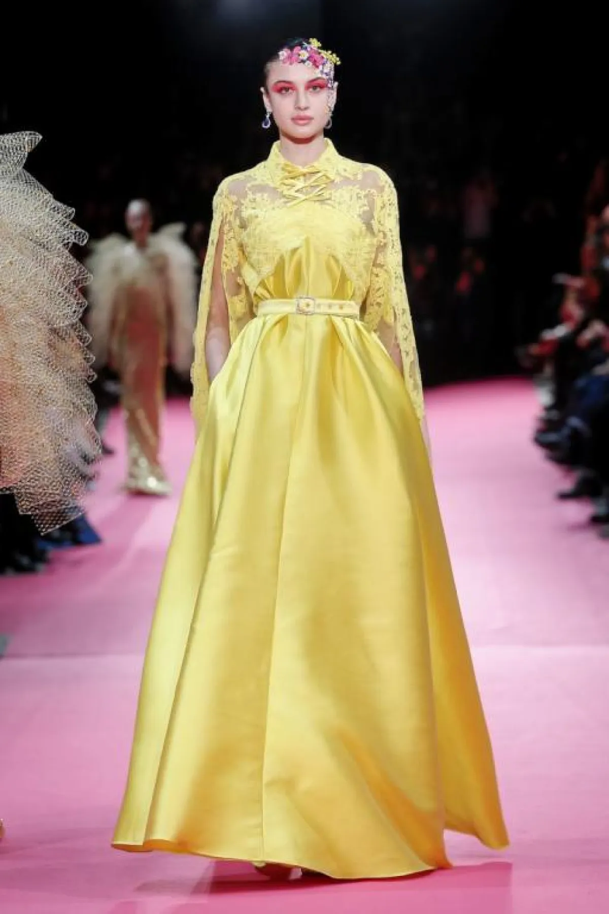 الألوان الفاقعة سوف تمنحكِ اطلالة مبهجة، كالفستان من Alexis Mabille أليكس مابيل، مع الأكمام الطويلة والياقة العريضة، وخامة الساتان اللامعة، مع حزام الخصر العريض، مثالي للصبيّة الممتلئة من منطقة الذراعين، والأرداف.