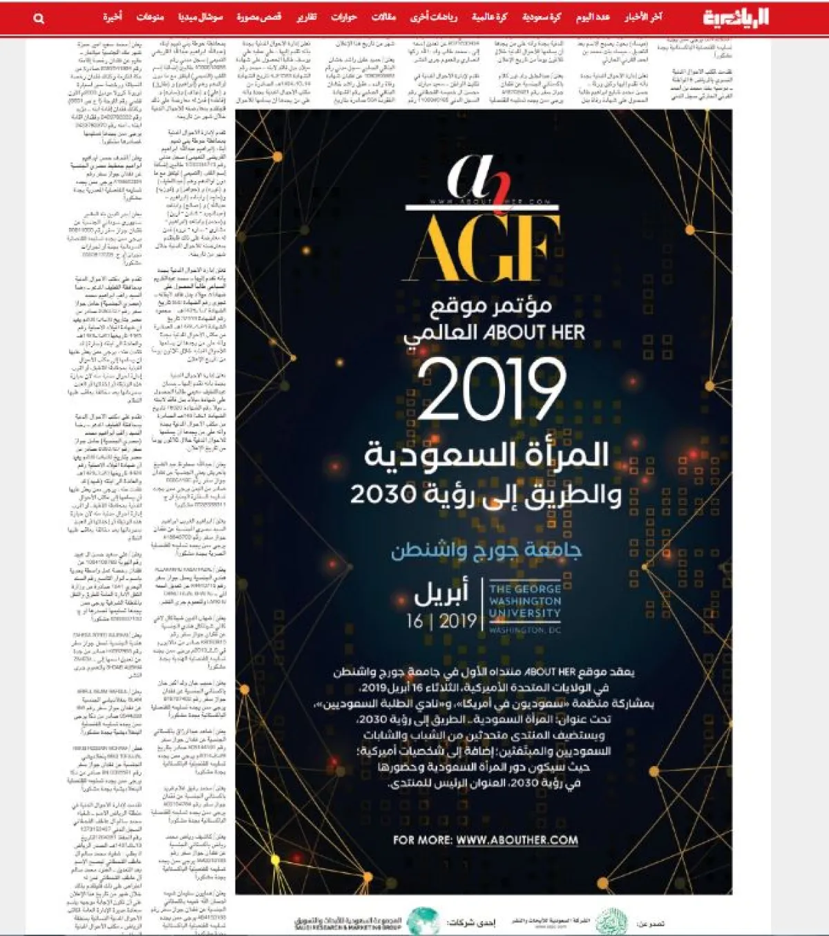 احتل منتدى منتدى موقع about her الذي سيقام اليوم في جامعة جورج واشنطن في واشنطن حيزاً واسعاً من اهتمام الصحف والمواقع العربية والسعودية والعالمية في إشارة واضحة الى أهمية انعقاد هذا المنتدى الأول من نوعه في أميركا الذي يتناول مسيرة المرأة السعودية  نحو الحداثة والطريق الى رؤية ٢٠٣٠ التي أطلقها ولي العهد الامير محمد بن سلمان .