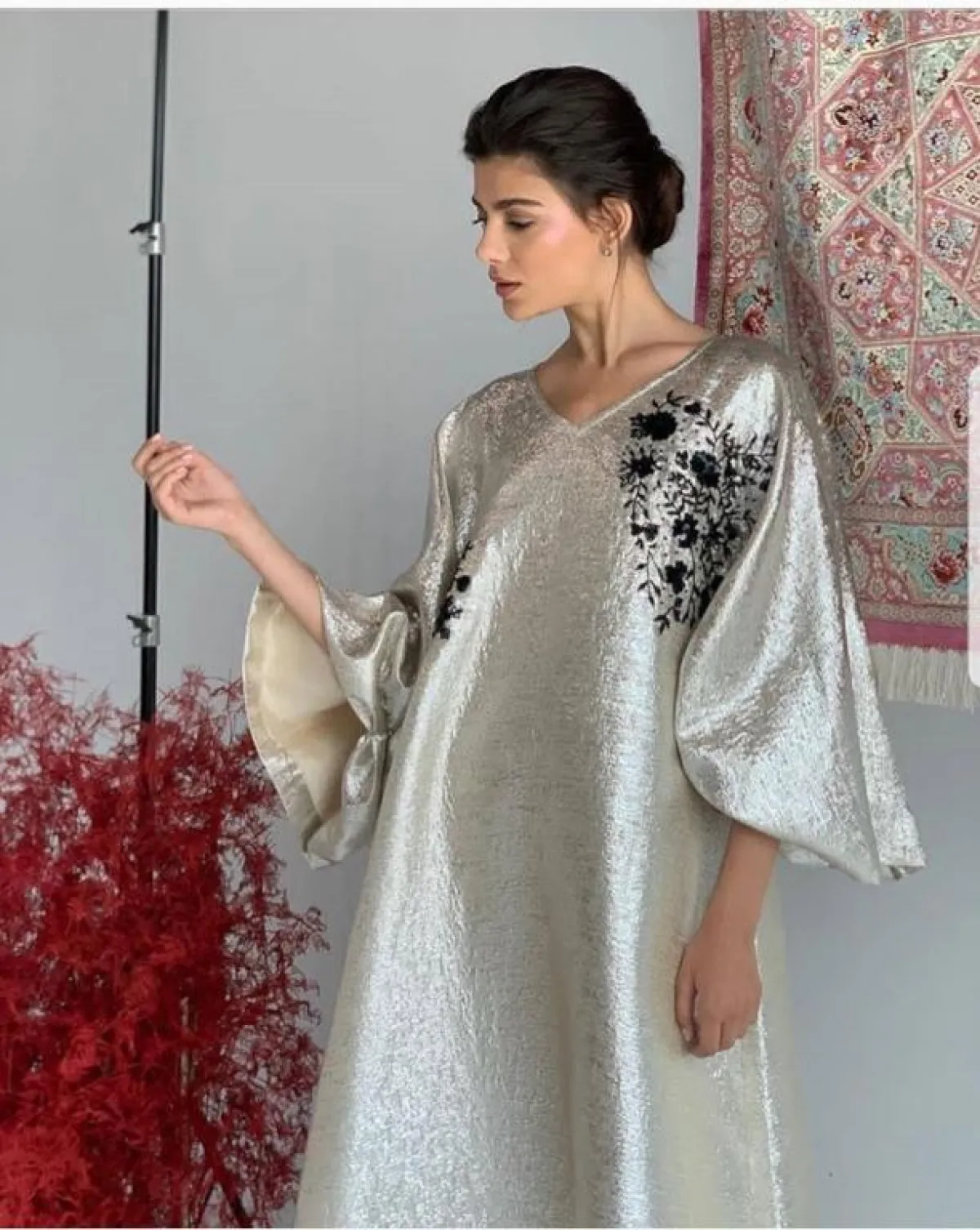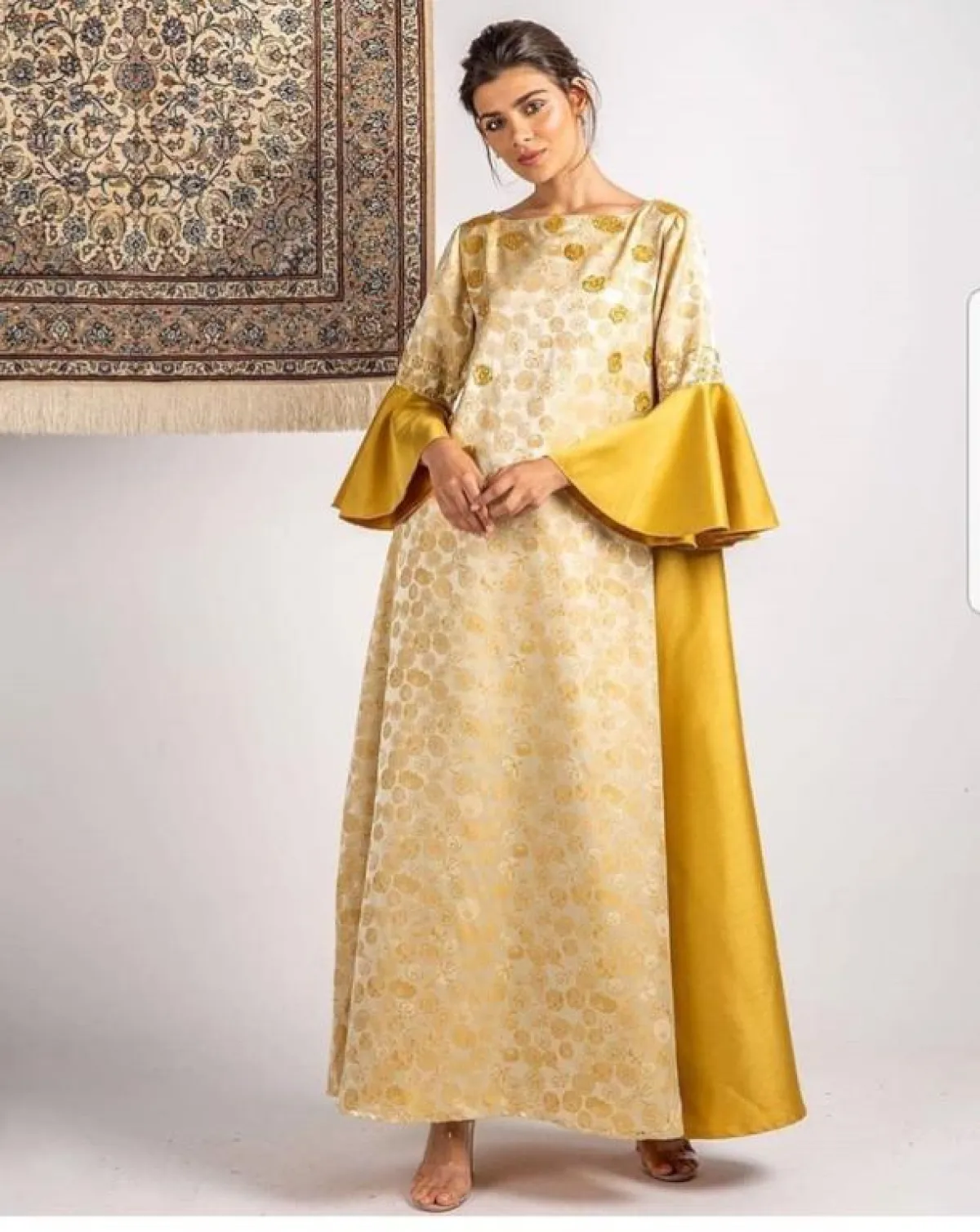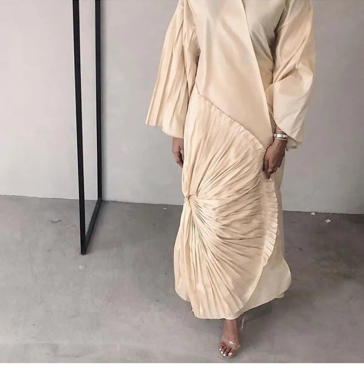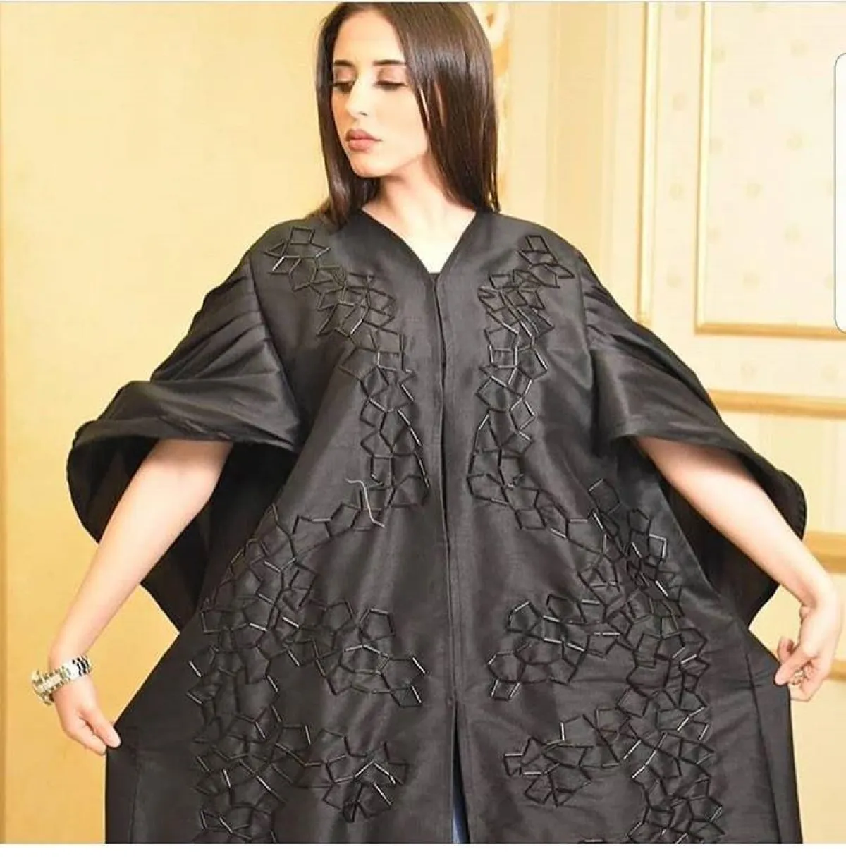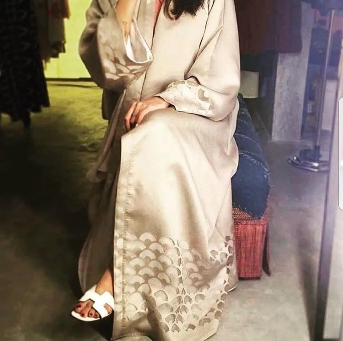 أعجبنا العباية من ذا سيين The Seen مع الأكمام المكشكشة، والقصيرة قليلًا، لهذا فهي مناسبة كعباية استقبال، إن كان لديكِ عزومة كبيرة، مع حجاب من الشيفون الكريمي، وحذاء بكعب الخوص الـ Wadges ليزيدكِ طولًا، ويناسب أيضًا أجواء الصيف.
