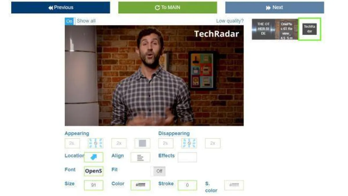 لمجرَّد تحميل الفيديو، يُمرَّر للأسفل فتظهر صور مُصغَّرة منه في عمود بعنوان "رئيس"، عندئذ يُمرَّر مؤشر الـ"ماوس" فوق هذا، مع النقر على رمز الترس الذي يظهر لفتح خيارات التعديل في Movie Maker Online.