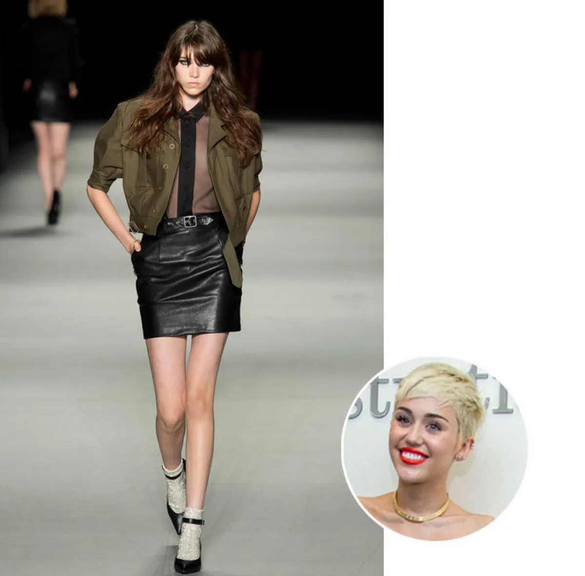 • تحب النَّجمة Miley Cyrus الستايل الجريء المثير للجدل، ونرى أنَّ التنورة الجلديَّة القصيرة مع القميص الشَّفاف من Saint Laurent قد تلفت انتباهها.
