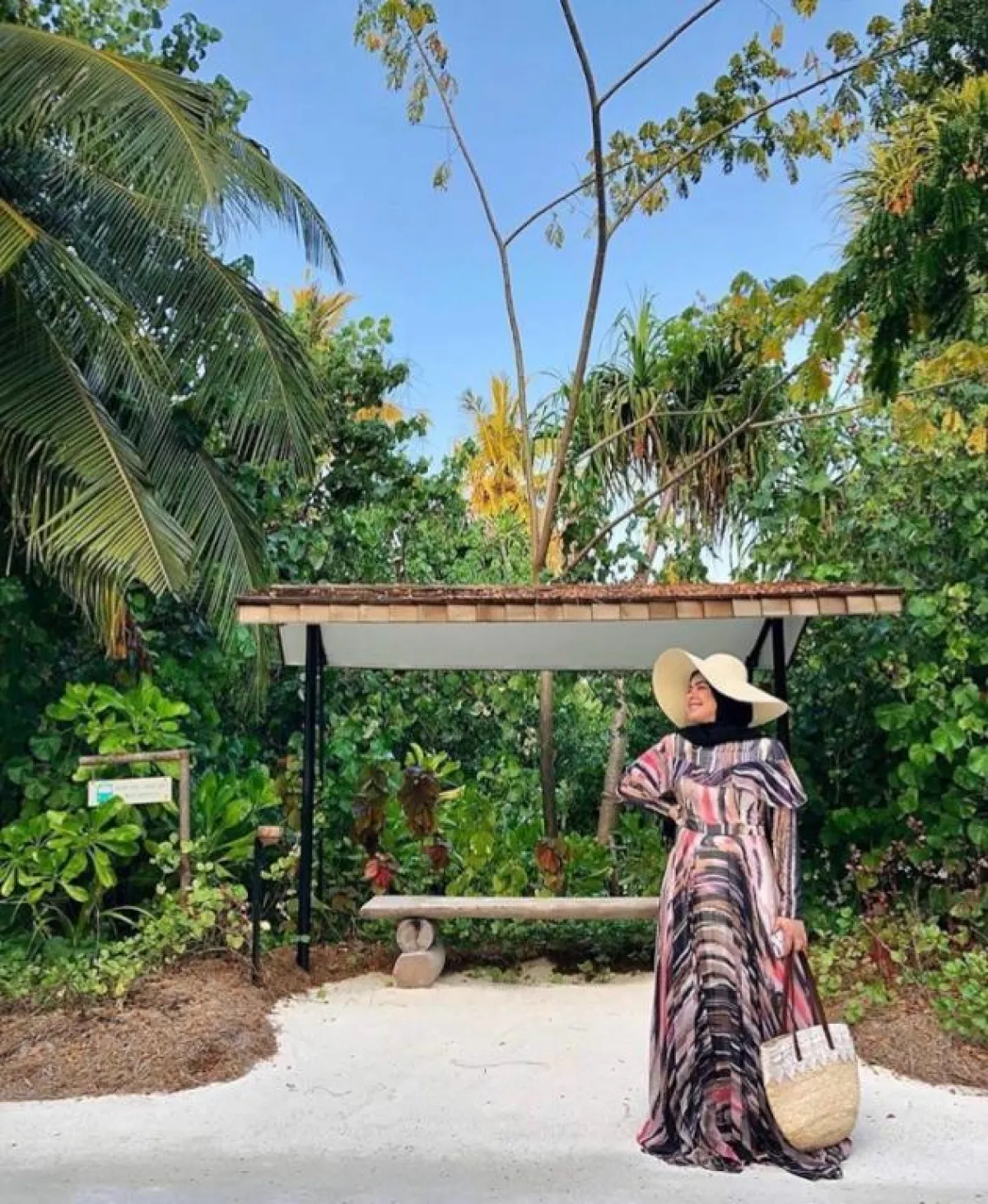 لفتنا أيضًا الفستان المطبع بالورود بالكامل، منعش وجذاب لاطلالتكِ الصيفية، كما اعتمدته بخامات خفيفة لطيفة على البشرة، ارتدت حجابًا باللون اللبني، ربما كان سيبدو لافتا أكثر مع الحجاب الأبيض، لكنّ اختيار قبعة الخوص كانت مناسبة، بخاصة هذا النوع الأنثوي المناسب مع لفات الحجاب.