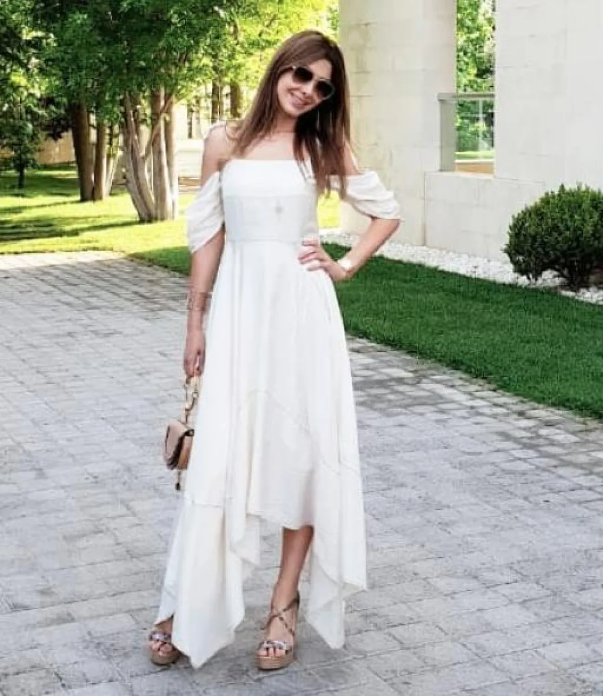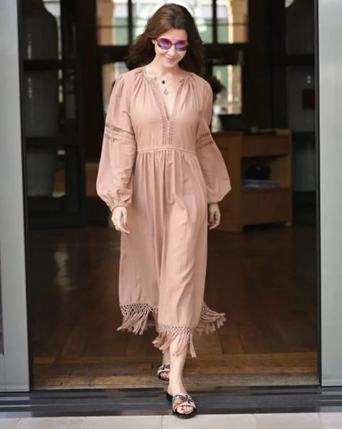 لاطلالة كاجوال اختارت نانسي عجرم فستان ماكسي باللون البيج، بتصميم ناعم بأكمام طويلة، ومزينًا بالشراريب، وقد نسقت معه صندلًا ملونًا من دون كعب، ونظارات شمسية عصرية بعدسات مرايا، وأكملت اللوك بعقد ناعم.