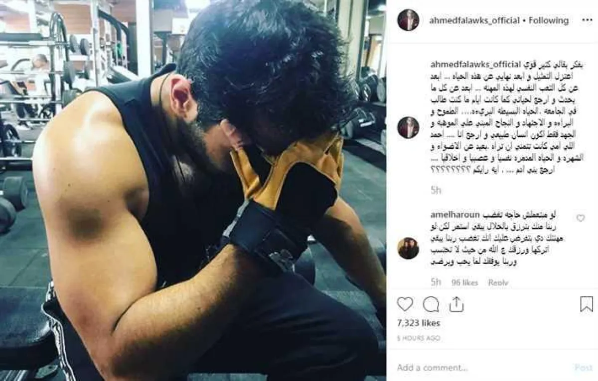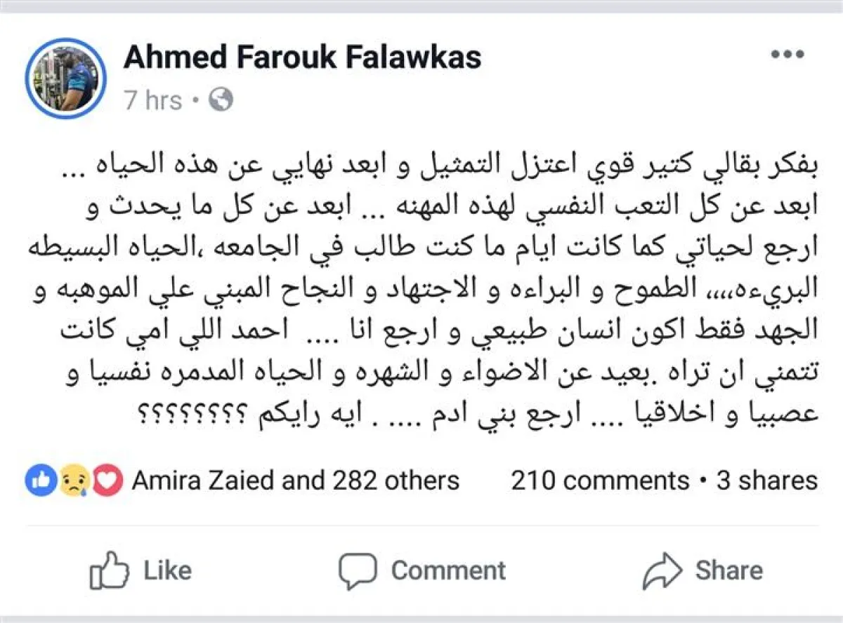 فلوكس طلب مشورة متابعيه عبر حسابه على موقع الفيس بوك قائلا: بفكر بقالي كتير قوي اعتزل التمثيل وأبعد نهائيا عن هذه الحياة، وأبعد عن كل التعب النفسي لهذه المهنة، وأبعد عن كل ما يحدث، وارجع لحياتي كما كانت أيام ما كنت طالب في الجامعة.