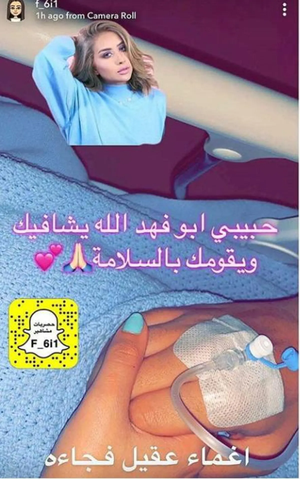 نشرت الفنانة فرح الهادي عبر حسابها على "سناب شات"، صورة لزوجها عقيل الرئيسي وهو يرقد في المستشفى.