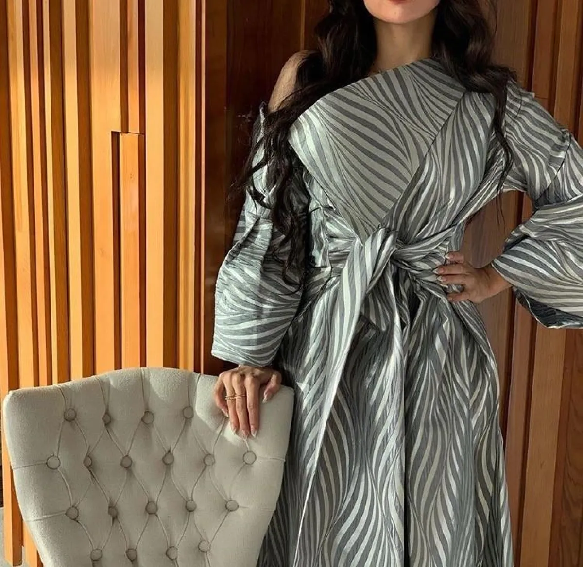 عبايات بتصميمات جريئة ومكشوفة بالعزائم الخاصة بالمنزل، أو للصبايا غير المحجبات، يمكنكِ اختيار العبايات المكشوفة، كالتصميم من الفاشينيستا جوري، مع الأكتاف المنسدلة، مزركشة ومخططة بالألوان الميتالك، نسقي معها صندلًا بكعب عالٍ، مع كلتش فضي إن اعتمدتِها بالعزائم الرمضانية.